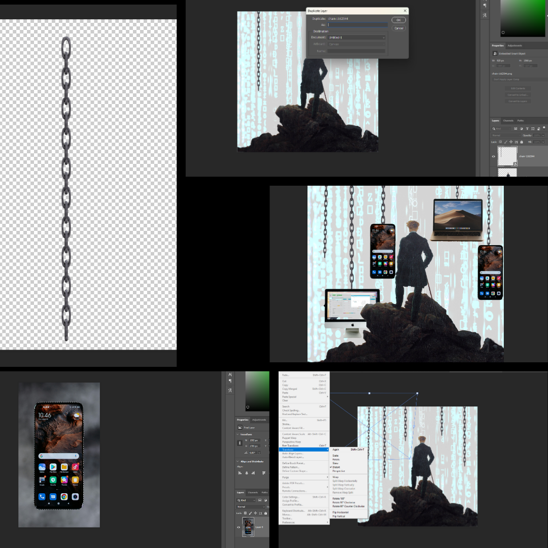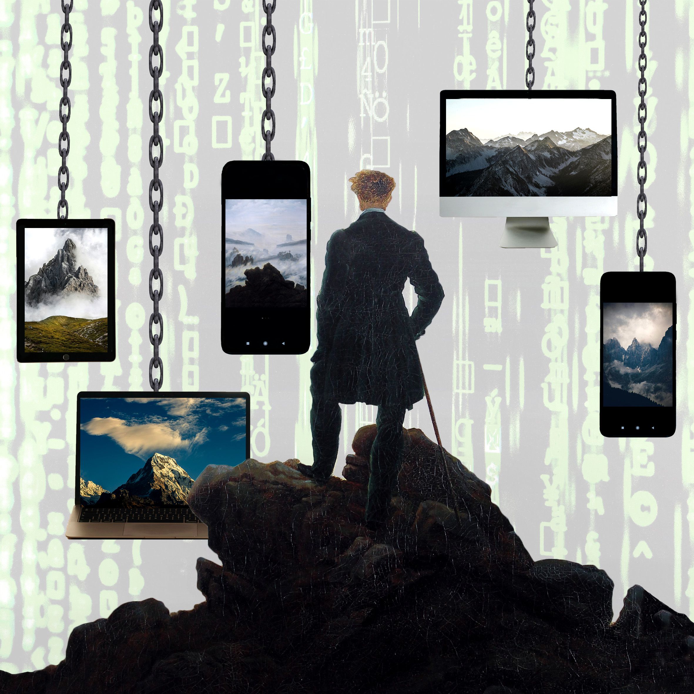 Als ich zufällig auf das Gemälde „Wanderer über dem Nebelmeer“ stieß, fühlte ich mich tief mit dem darin ausdrucksstarken Gefühl der Einsamkeit und Kontemplation verbunden. Das Bild des Mannes, der auf einer Felsklippe steht und über den weiten Horizont blickt, inspirierte mich zu meiner eigenen Interpretation: einer Collage, in der Berge durch vom Himmel hängende Telefone, Laptops und Computer ersetzt werden. Auf ihren Bildschirmen erscheinen Berge, und ein Bildschirm, in der Nähe des Mannes, spiegelt genau den Felsen wider, auf dem er steht – ohne ihn selbst zu zeigen.