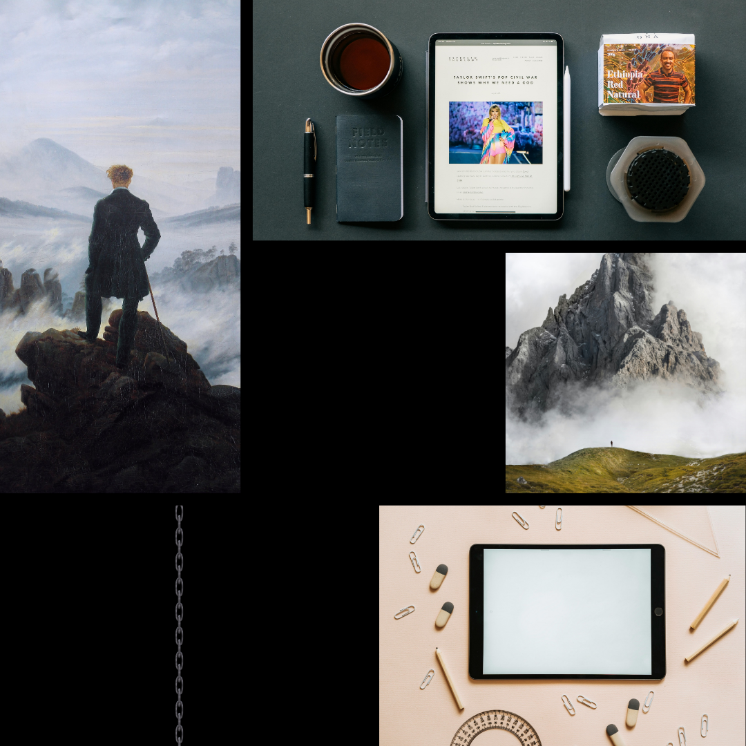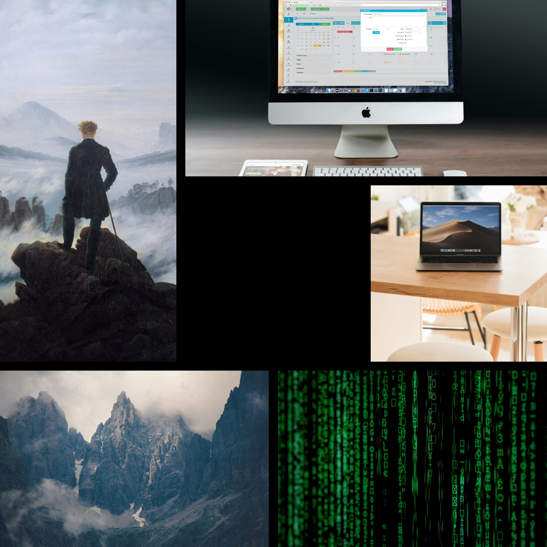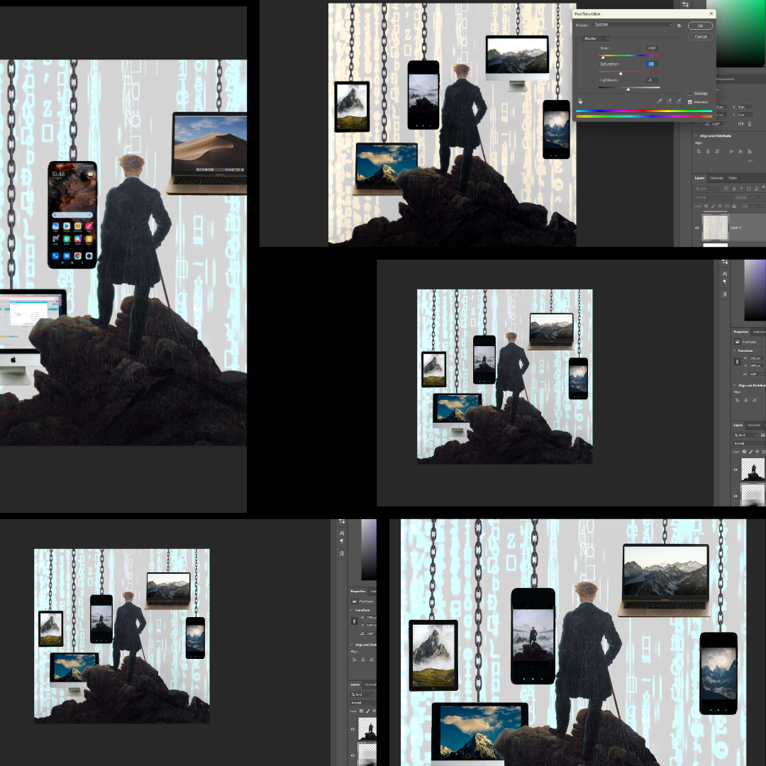 When I stumbled upon the painting “Wanderer above the Sea of Fog”, I felt a deep connection to its sense of solitude and contemplation. The image of the man standing on a rocky cliff, gazing out over the vast horizon, inspired me to create my own interpretation: a collage where mountains are replaced by phones, laptops, and computers hanging from the sky. On their screens, mountains appear, and one screen, close to the man, reflects the very rock he stands on—without revealing him.