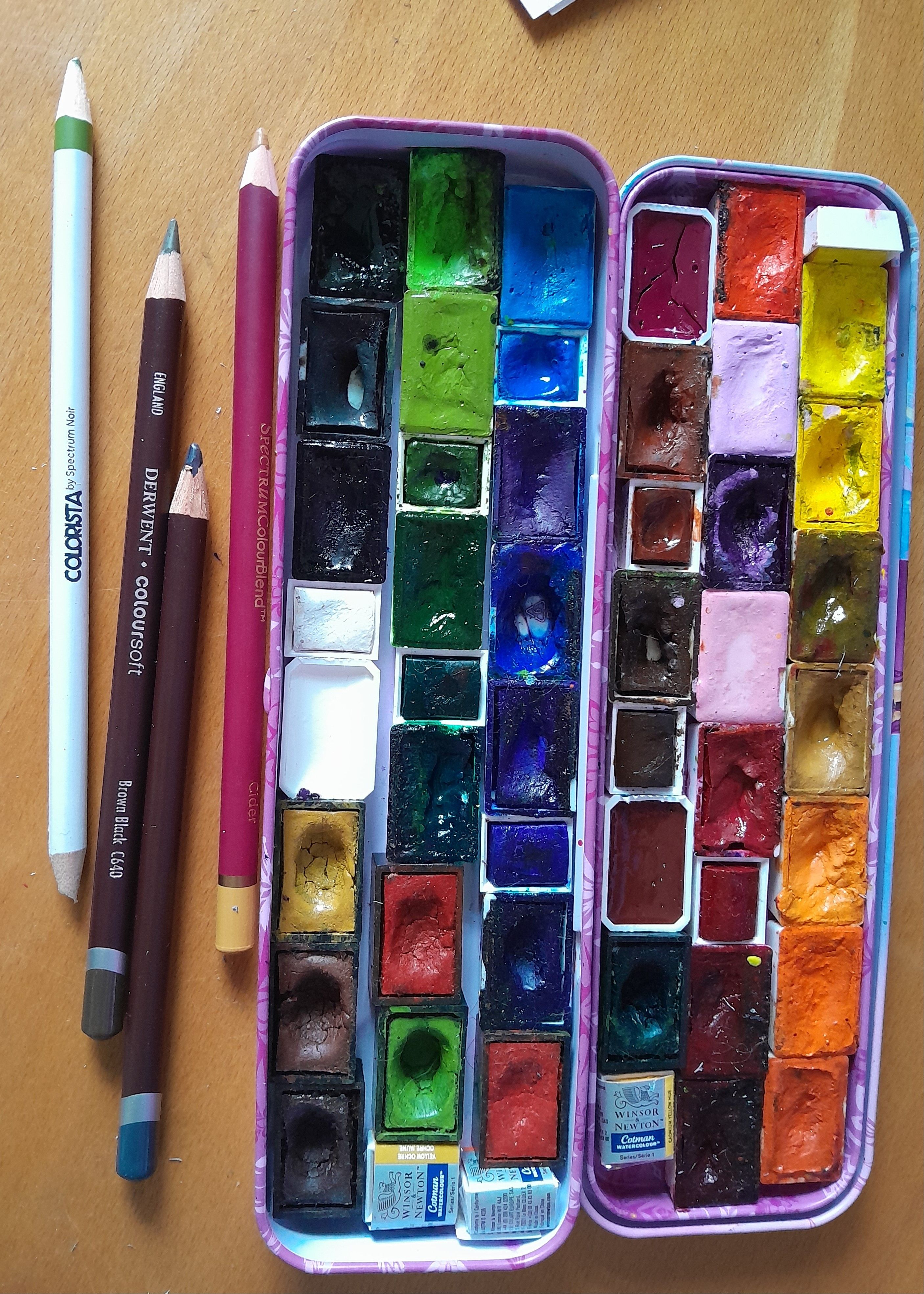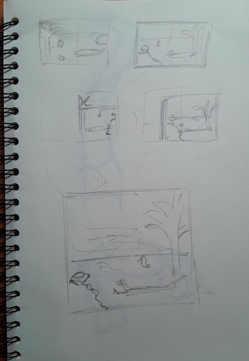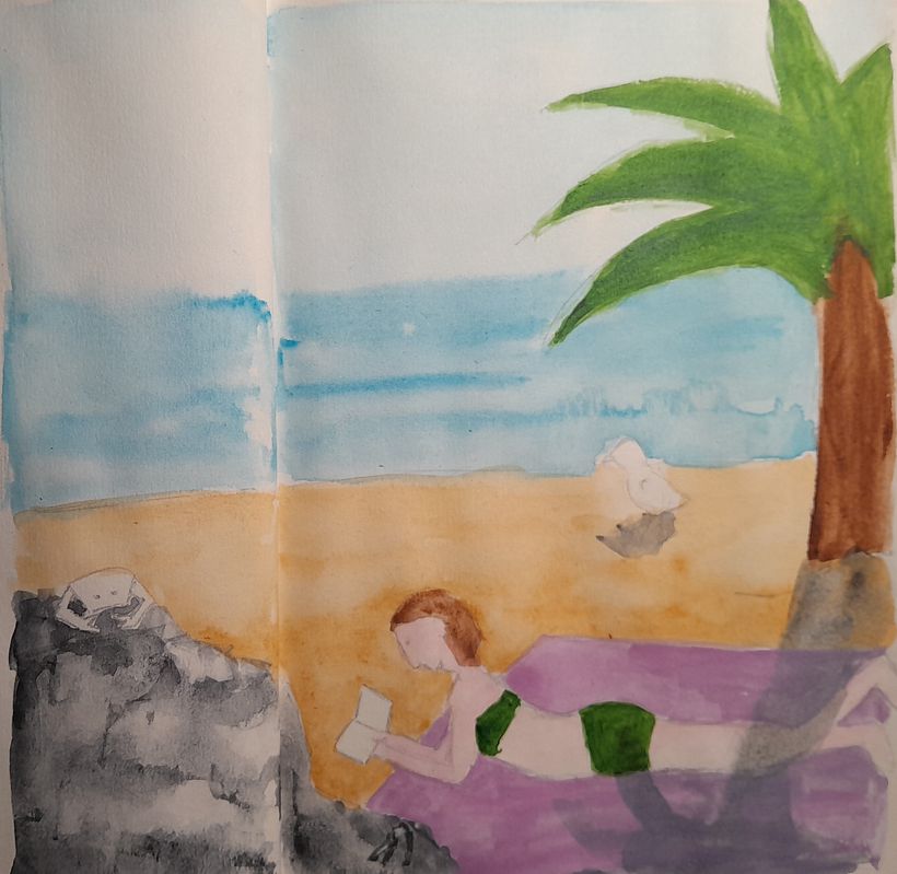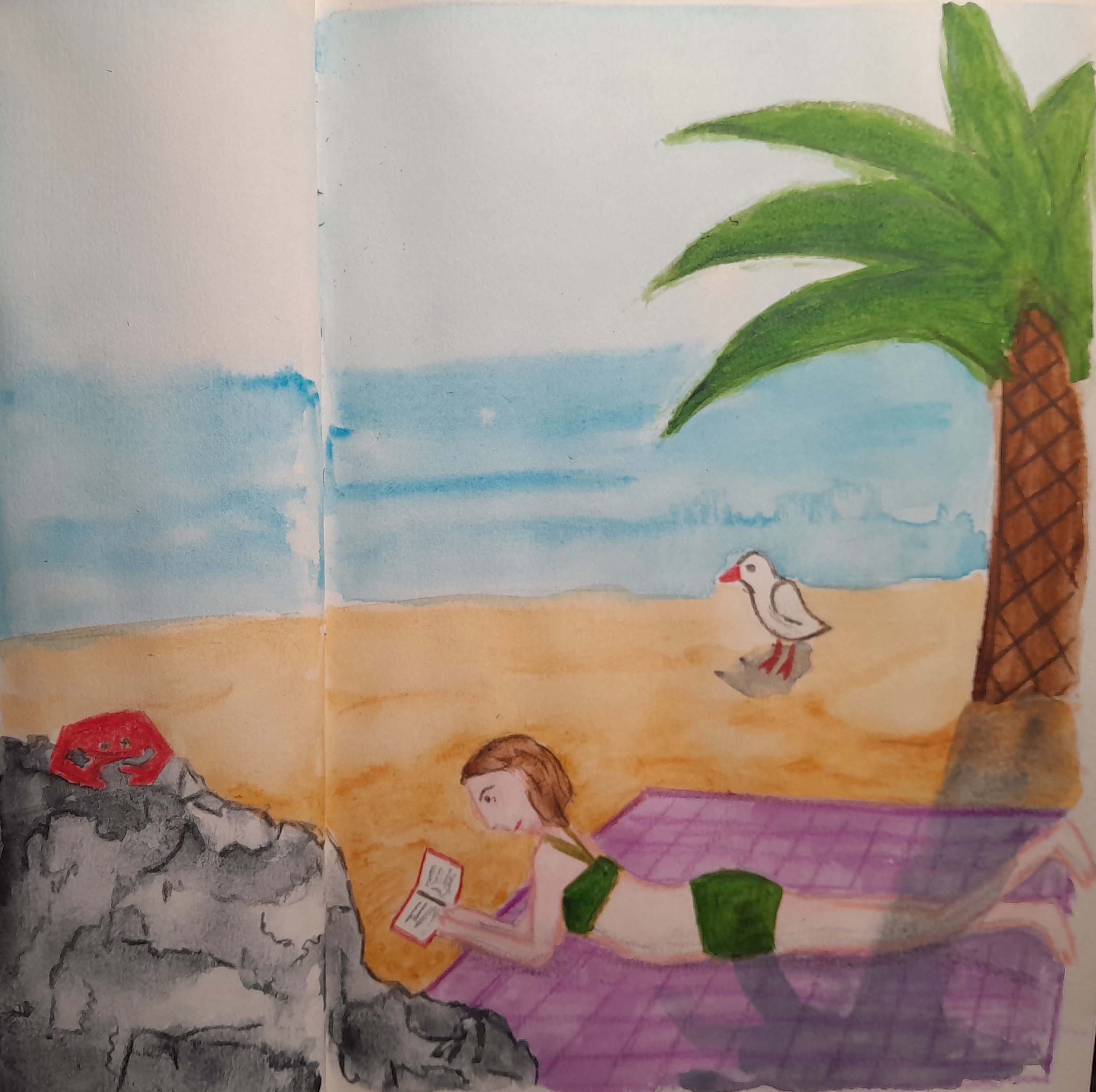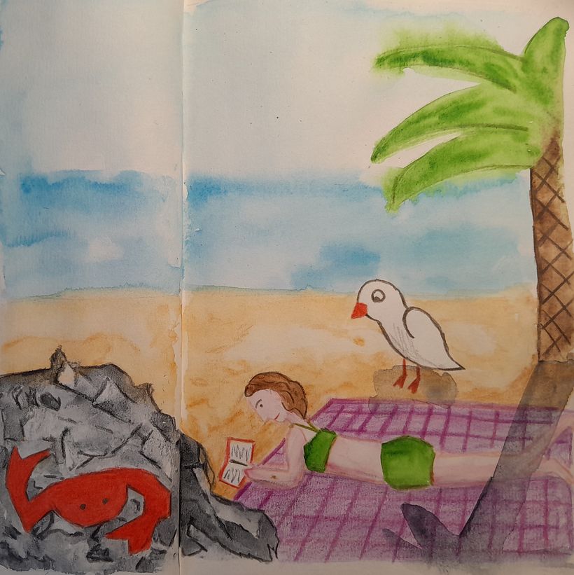 I sketched a portrait of myself reading on a beach, my favourite activity. I decided to include a palm, a bird, and a crab on a rock. After trying out several compositions, I decided to use a square format across two pages of a sketchbook.