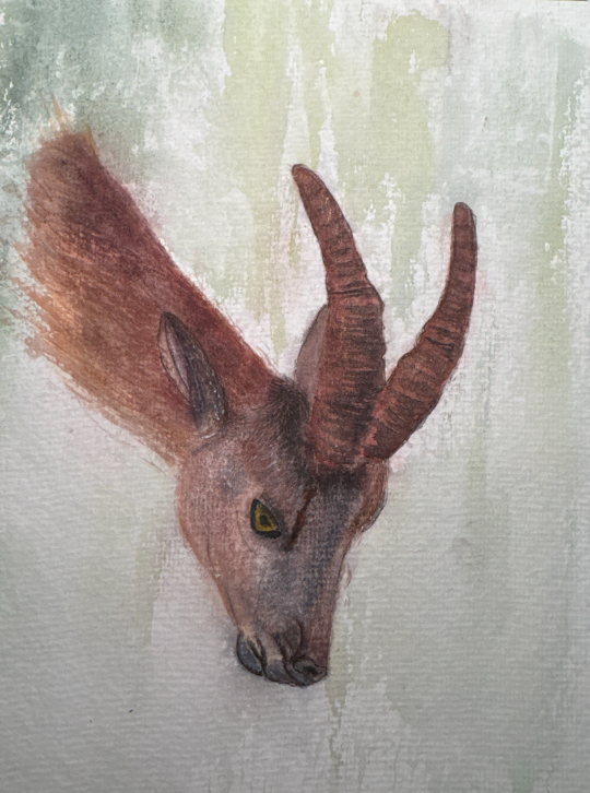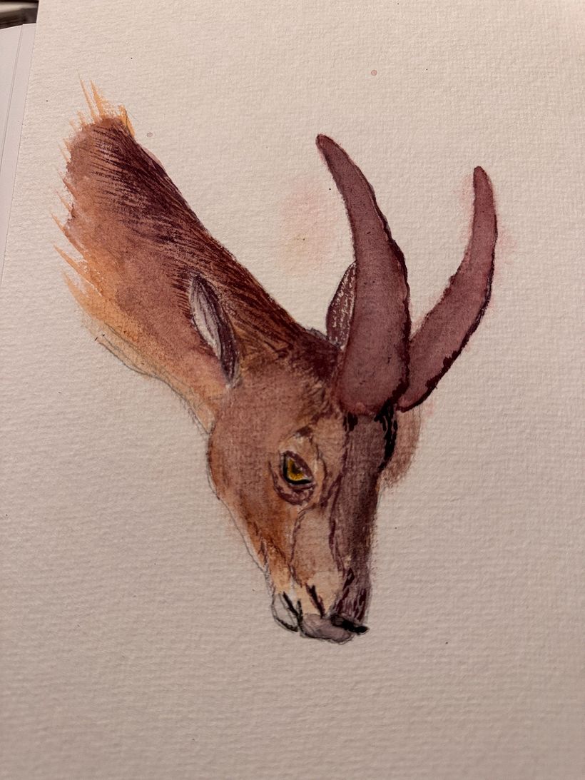 In meiner Aquarell-Interpretation wollte ich besonders die Struktur des Fells, das Licht auf den Hörnern und den stillen, wachen Blick einfangen.