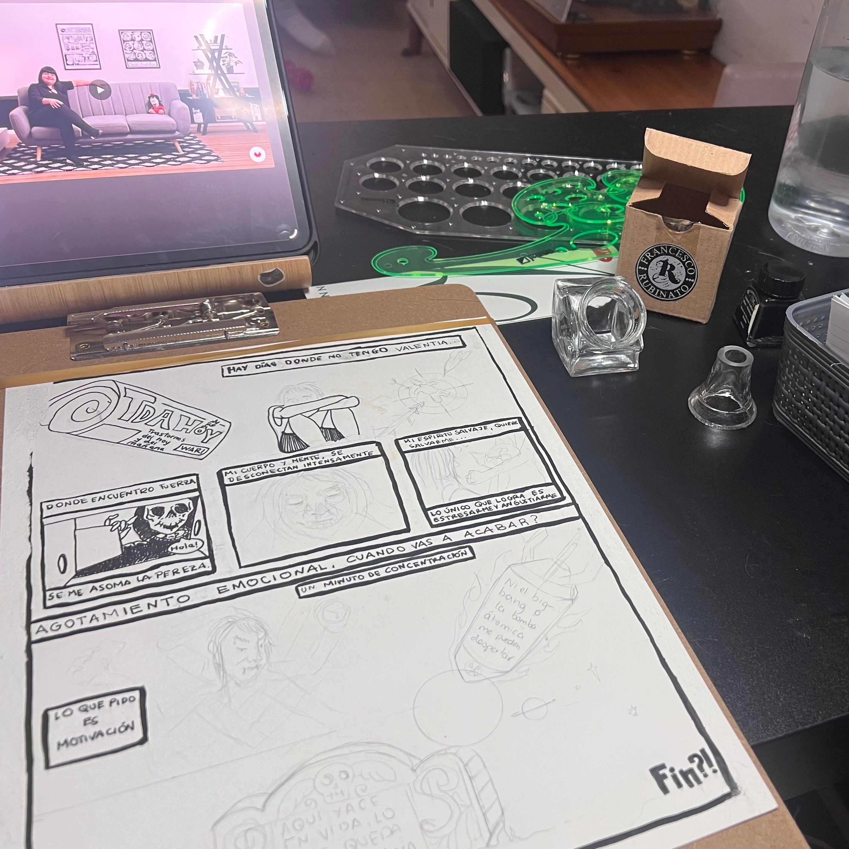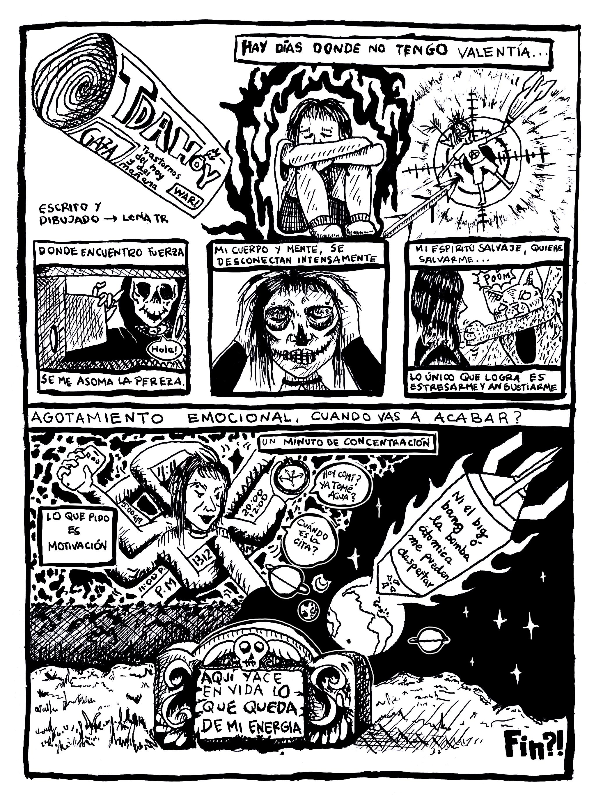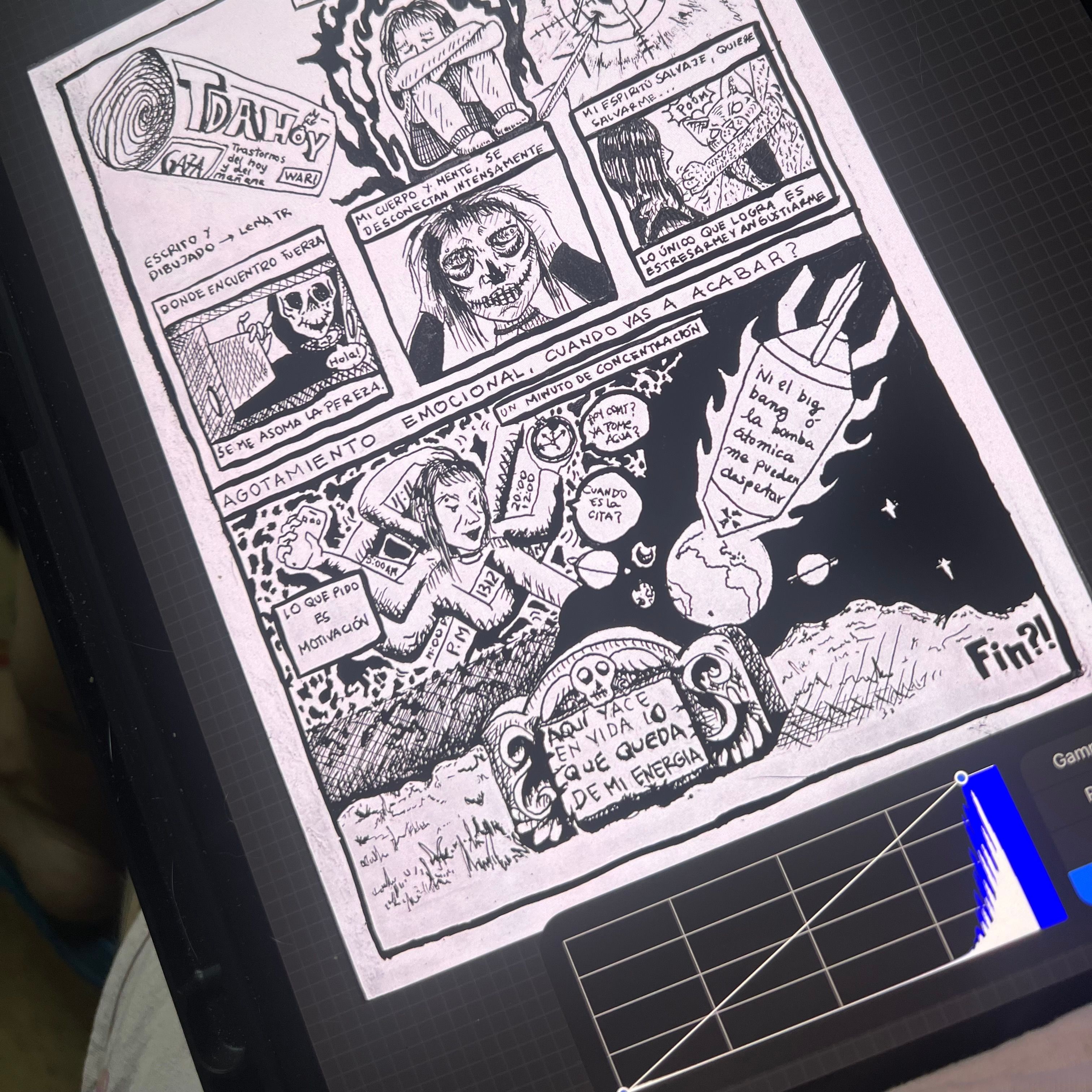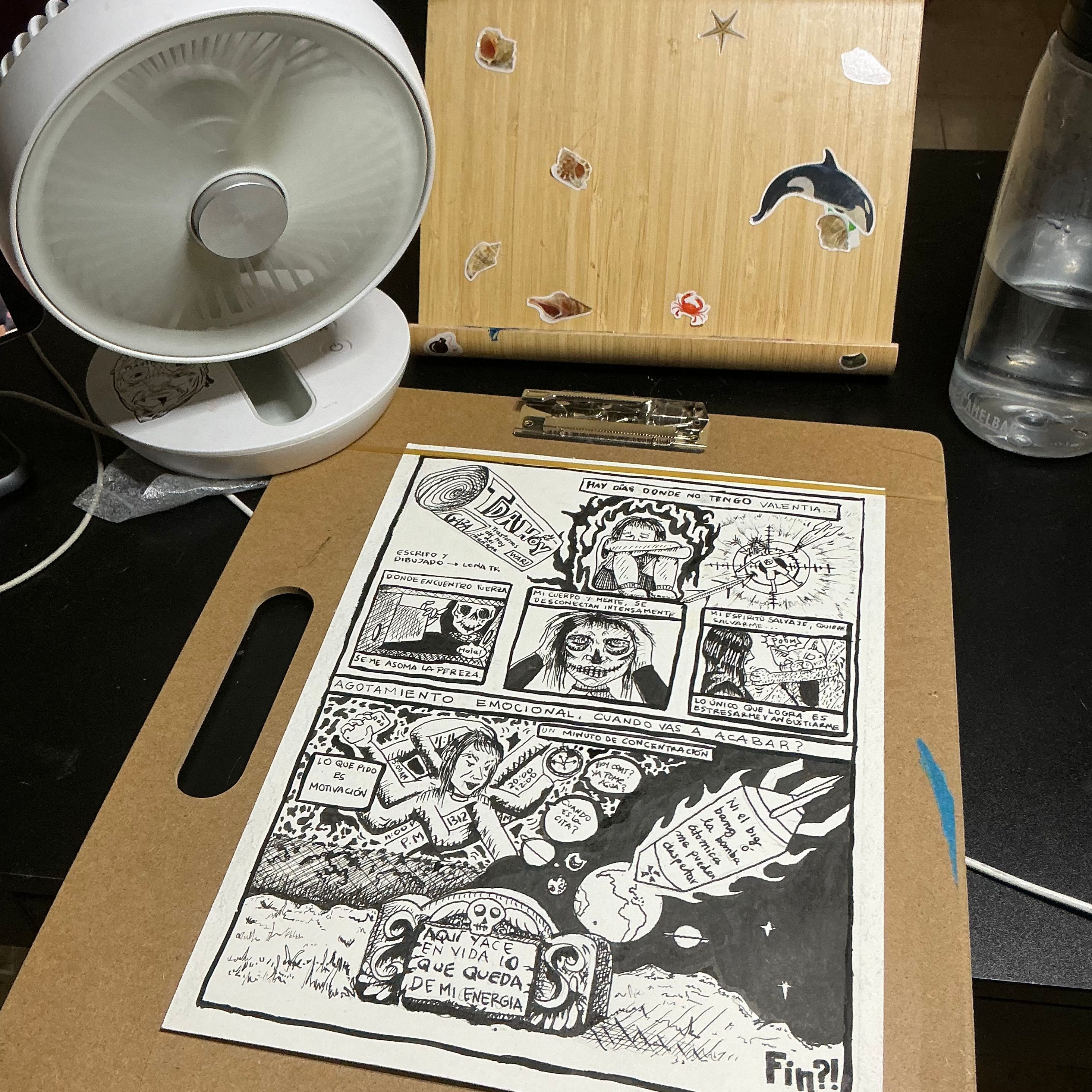 Partiendo de lo aprendido, decidí ilustrar un poema al trastorno del déficit de atención. Busque referentes para guiarme y seguí las enseñanzas aprendidas en este curso. Luego de pasar la idea al papel con lápiz, pase al entintado. En la digitalización del proyecto no pude hacer uso de un scanner lo que me llevó a tomar un foto la cual no fue la mejor. Con el software de Procreate hice algunas correcciones, desde color para lograr el blanco y negro que quería y detalles que salieron mal durante el proceso.