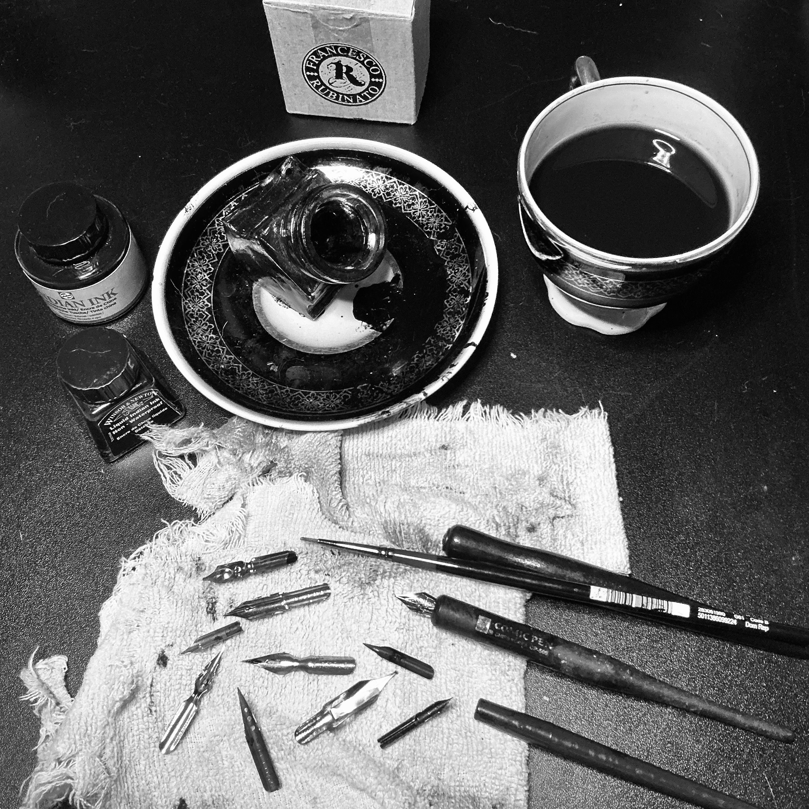 Use tinta china, mis plumillas favoritas y un tintero que conseguí en Venecia.