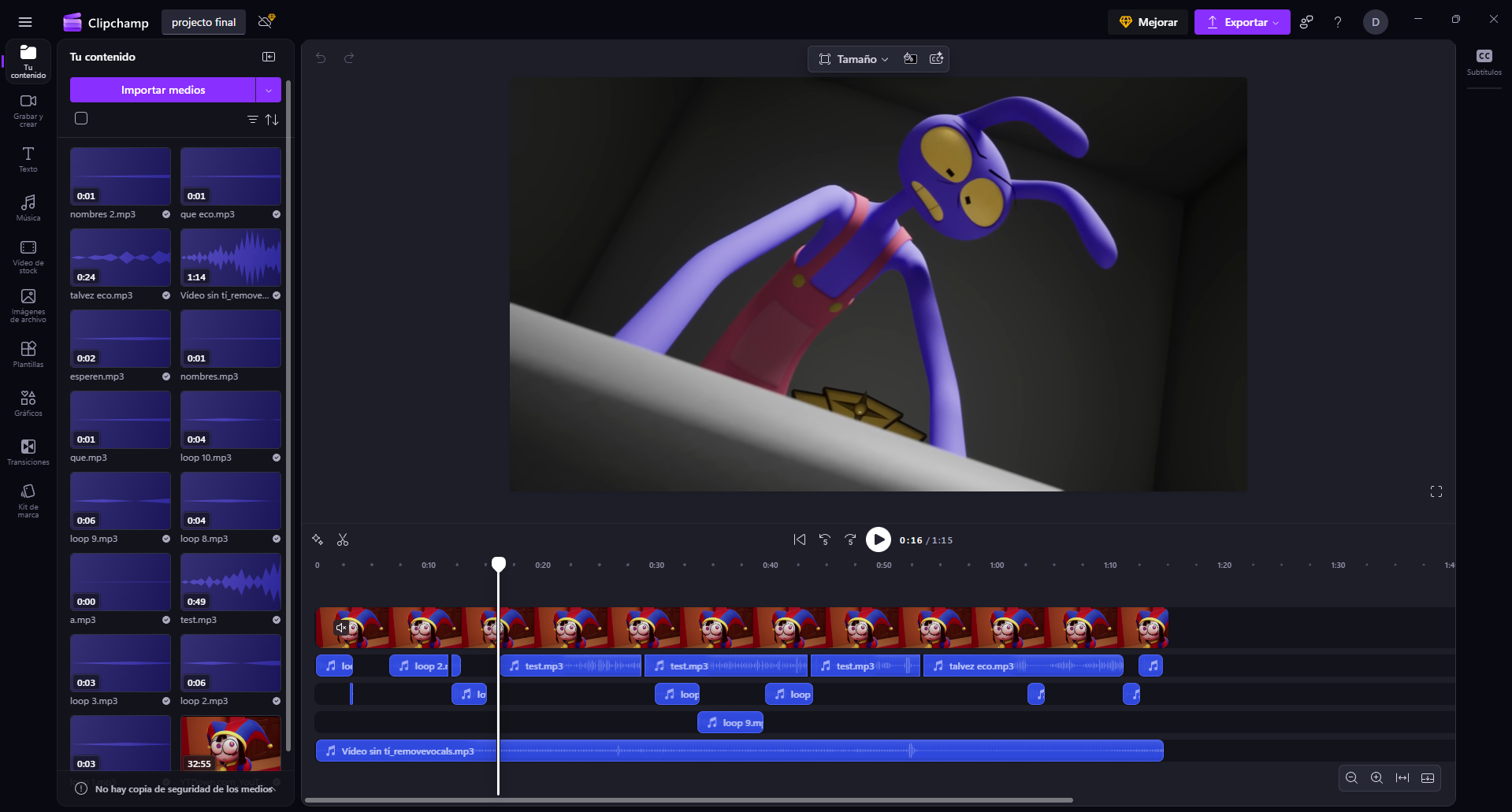 Bueno hice 2 doblaje en los cuales me centre en 2 personajes (Jax y Shadow/Cid) que en los demás, esos 2 personajes al tener secuencias mas largas de sonidos/expresiones o risas se me complico bastante ya que lo hice con 2 herramientas el audacity que es gratis y solo para grabar audio y el clipchamp que viene con el computador y es un editor de video pero no tiene mucho.
