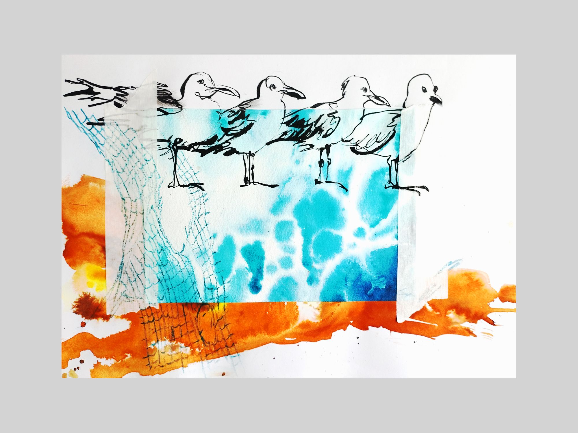 Мне показалось, что мне проще работать с простыми материалами. Это тушь, писчая и акварельная бумага, акварель, цветные карандаши, малярный скотч