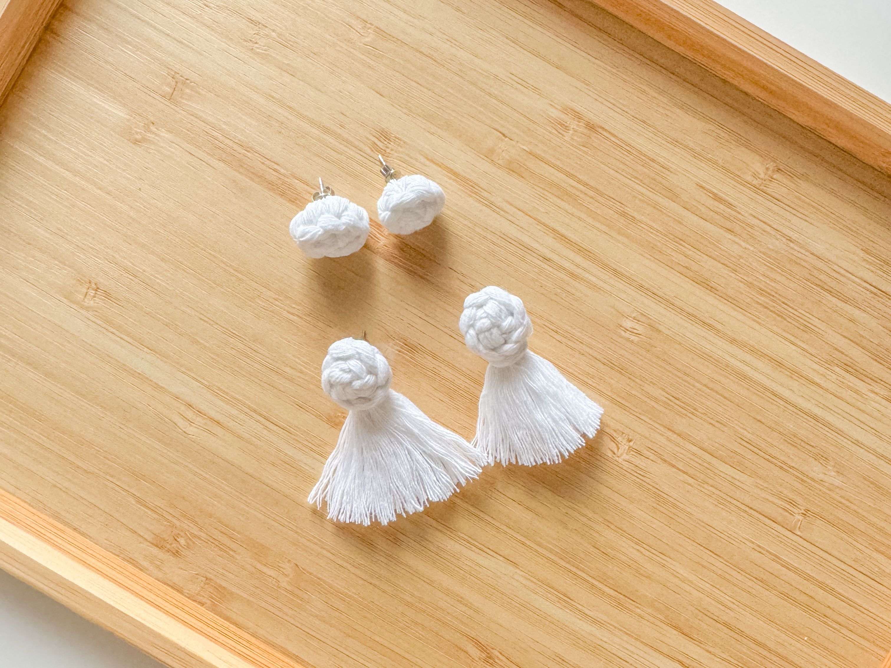 Para estas peças utilizei barbante de macramé na cor branca e brincos em aço inoxidável.