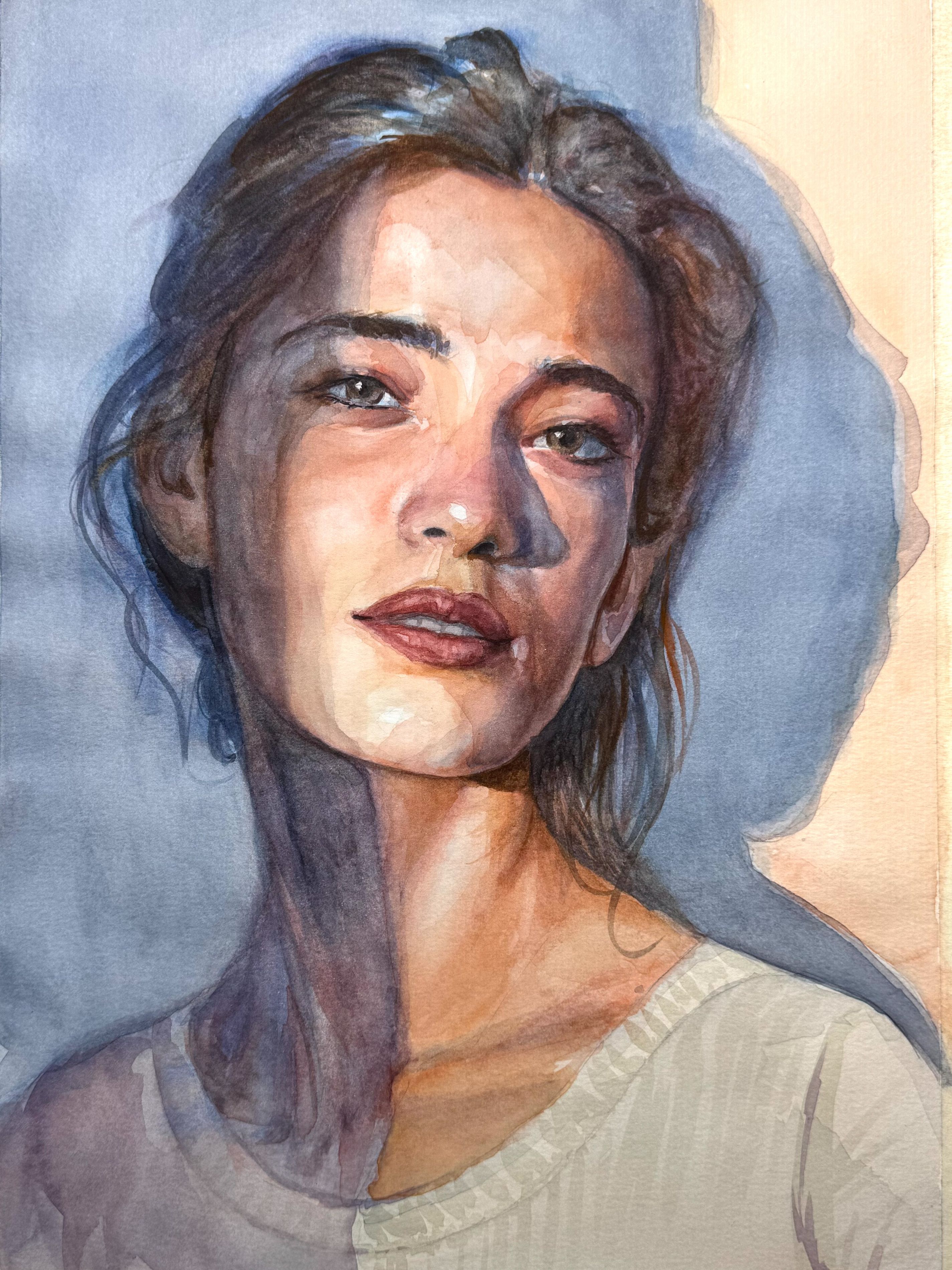 Aunque me ha resultado una técnica compleja de controlar, creo que en el curso se dan bastantes explicaciones y consejos para poder iniciarse e ir avanzando. A pesar de las dificultades me he divertido, y he disfrutado del proceso, así que seguiré probando a ver si consigo controlar el aspecto del retrato, y mejorar la transparencia de las capas, etc. Empecé el retrato intentando seguir las indicaciones y los pasos del curso, pero rápidamente se me ha ido opacando todo el retrato con poco control sobre el resultado final.