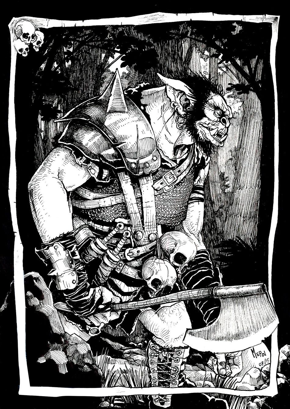 Diseño e ilustración de un Bugbear, también llamado Osgo en español, realizada en blanco y negro con estilográfos y marcadores.