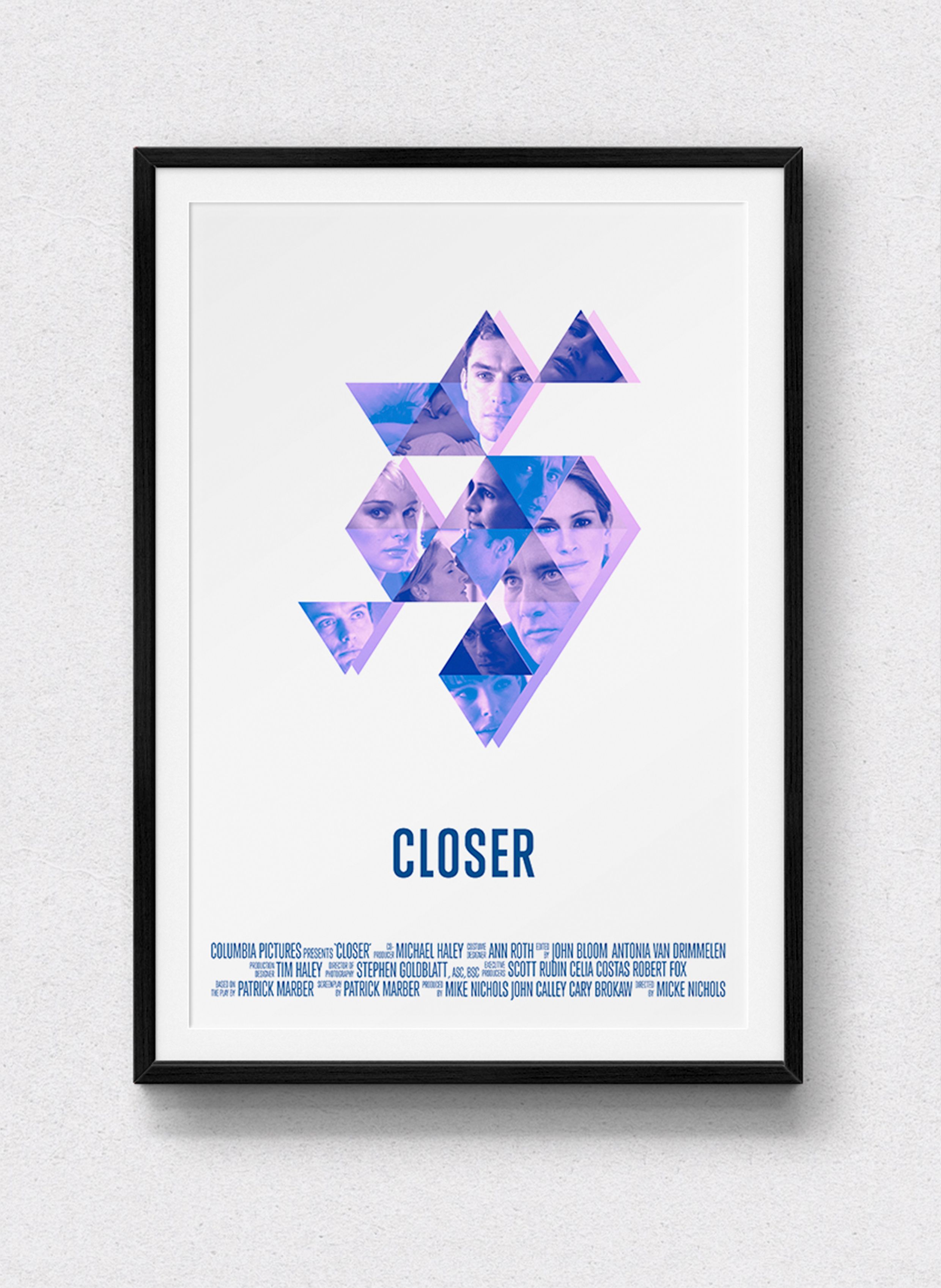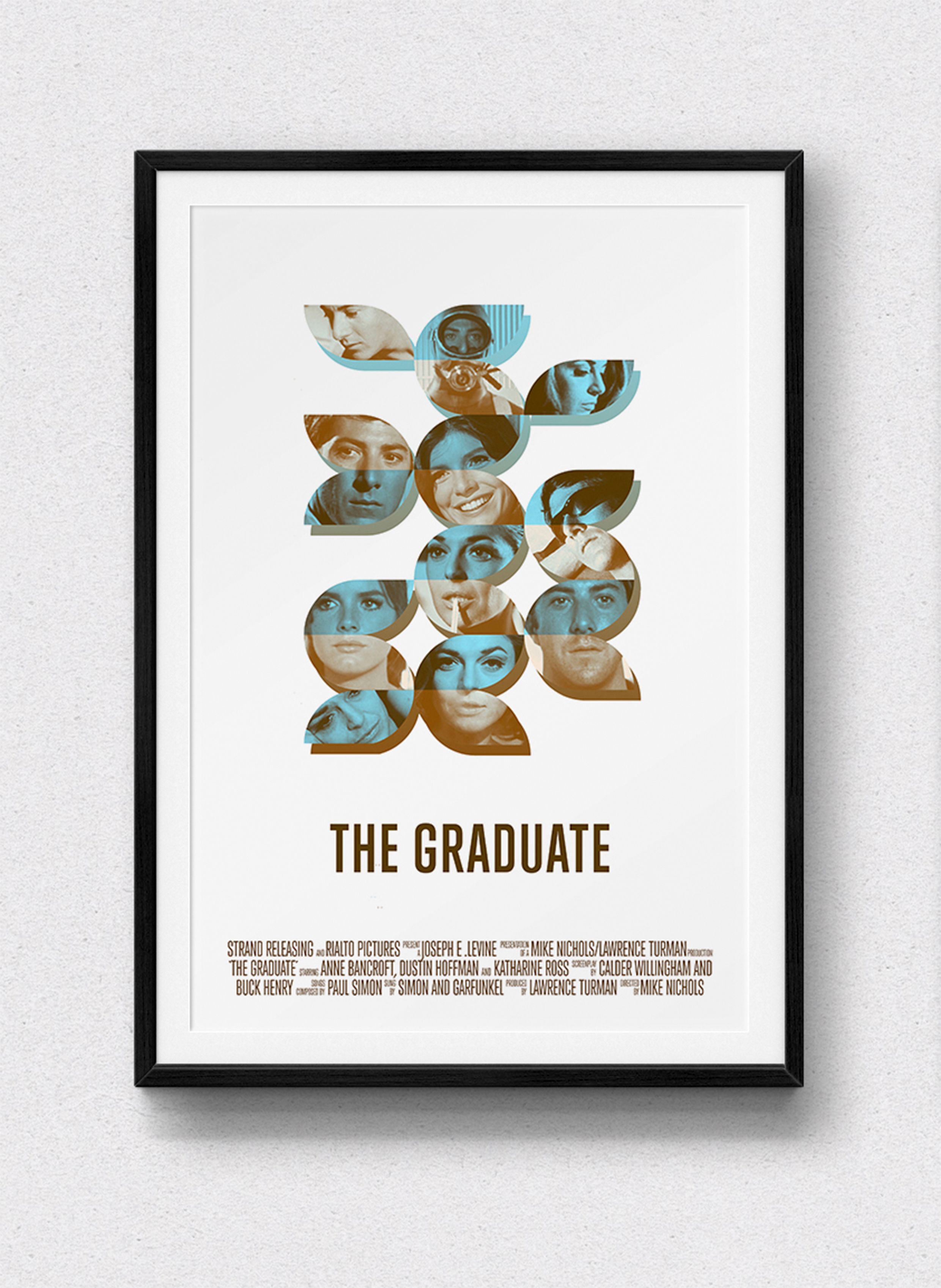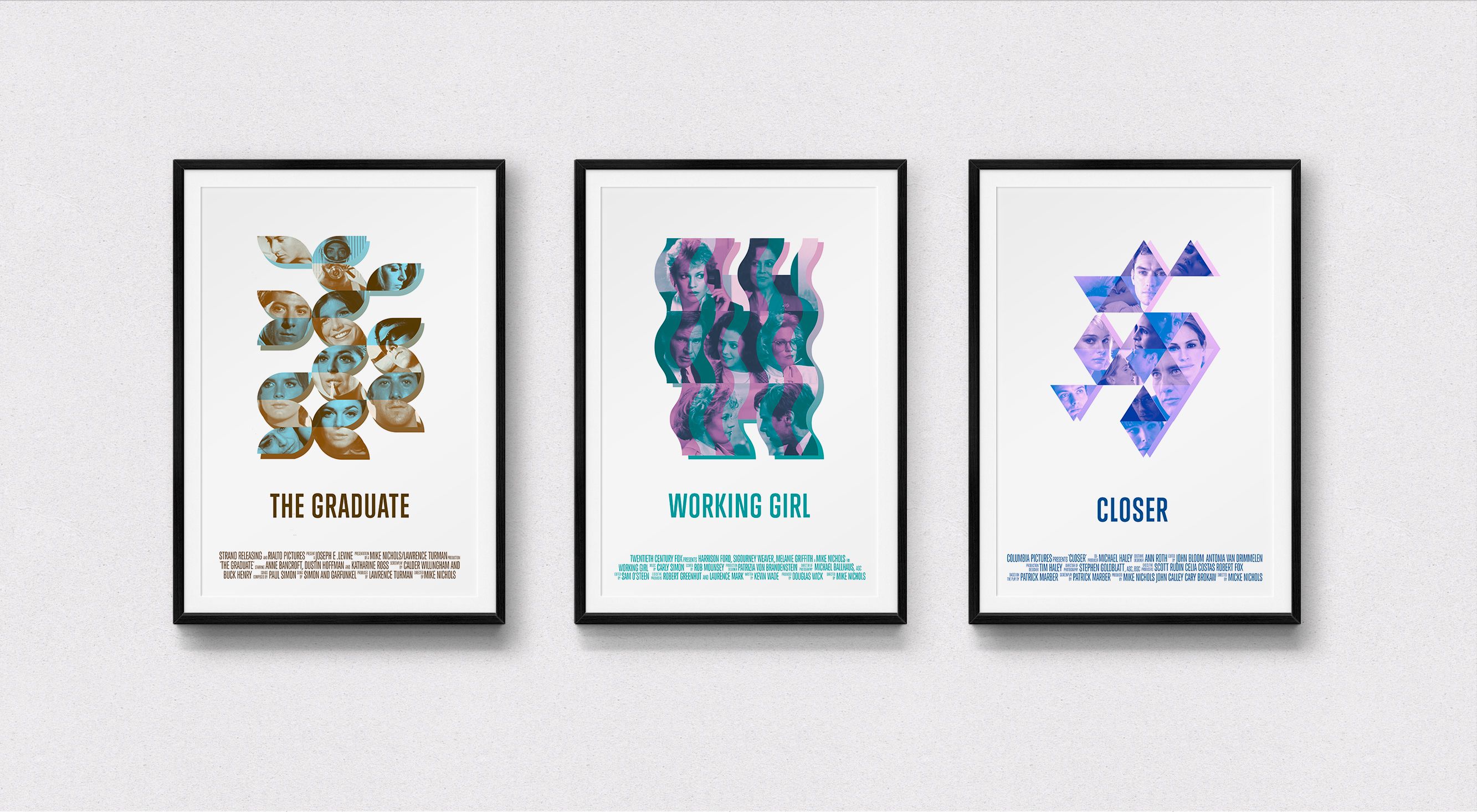 Hoy hace un año que se fue Mike Nichols. Tres carteles conmemorativos para tres de las más representativas películas de este director de cine: El graduado (1967), Armas de mujer (1988) y Closer (2004). Los fragmentos de los fotogramas empleados en la composición se enmarcan en una retícula geométrica que alude a los patterns propios de los años 60, 80 y 2000.