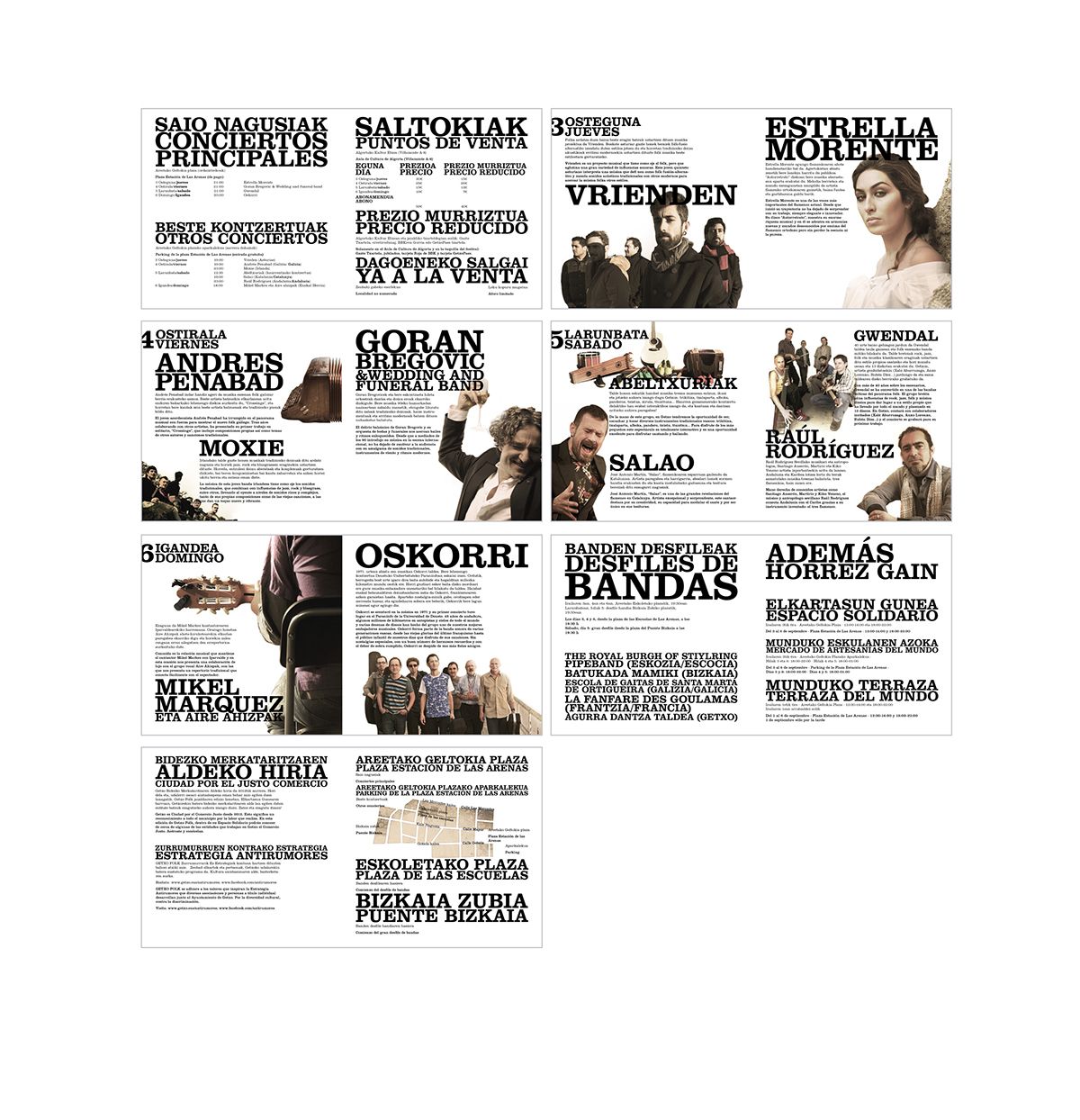 El folleto consta de 8 páginas, en las cuales encontramos el horario de conciertos, la tabla de precios, información sobre los artistas y bandas invitadas, otras actividades, la política del festival y la localización; toda esta información desarrollada tanto en euskera como en castellano de manera que no se le dé más importancia a un idioma respecto al otro. Mientras que para el texto en euskera se utiliza la variante “light” de la tipografía Clarendon, en el caso del texto en castellano se recurre al peso “roman”. En la parte trasera del folleto se localizan tanto los organizadores como la información de contacto. En esta, siguiendo la referencia establecida en la portada, se extiende una nervadura, generando así una conexión visual en toda la parte exterior del folleto.