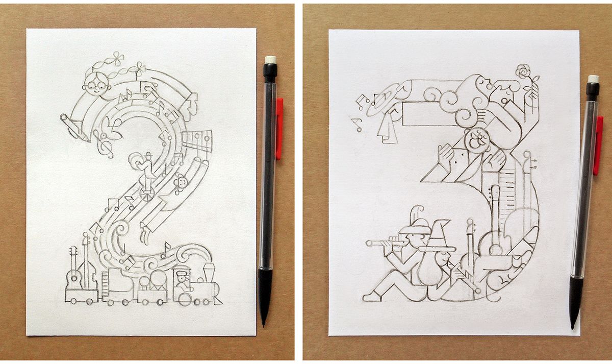 Números para seis cubiertas de libros de música para los cursos de primaria, Ed. Edelvives.