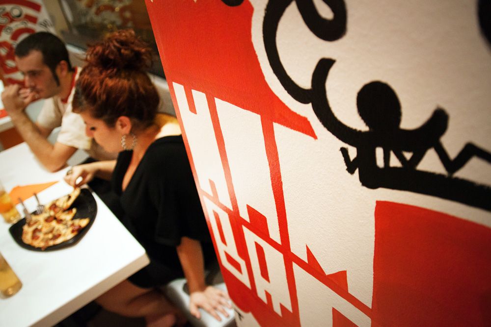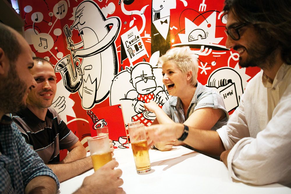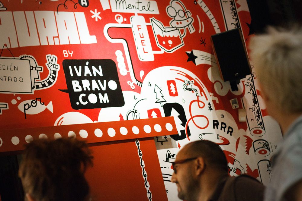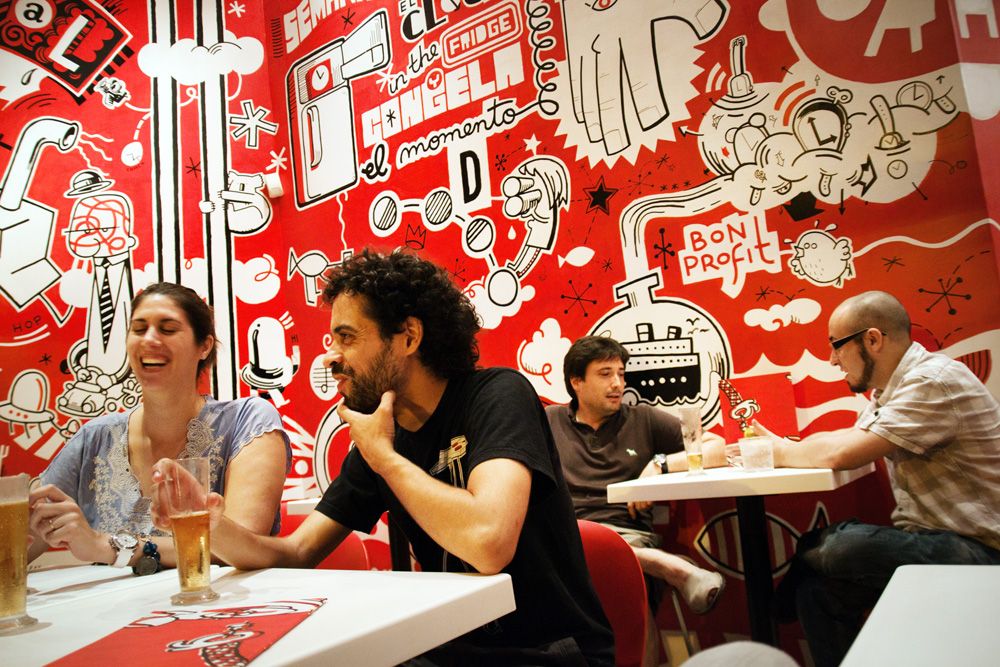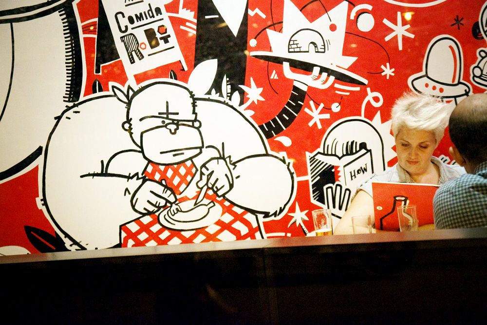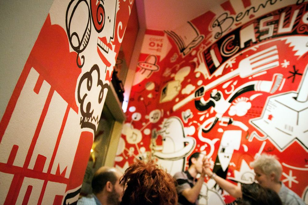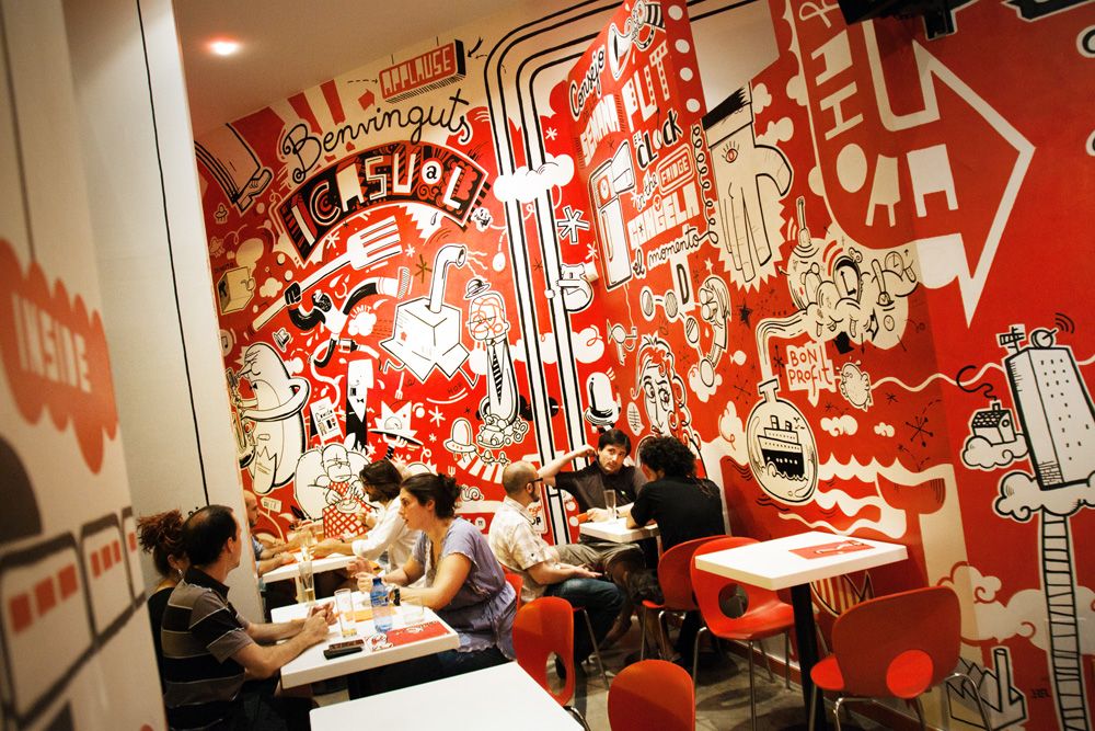 Mural de 120m2 pintado a mano en el bar-restaurante Icasual de Barcelona.