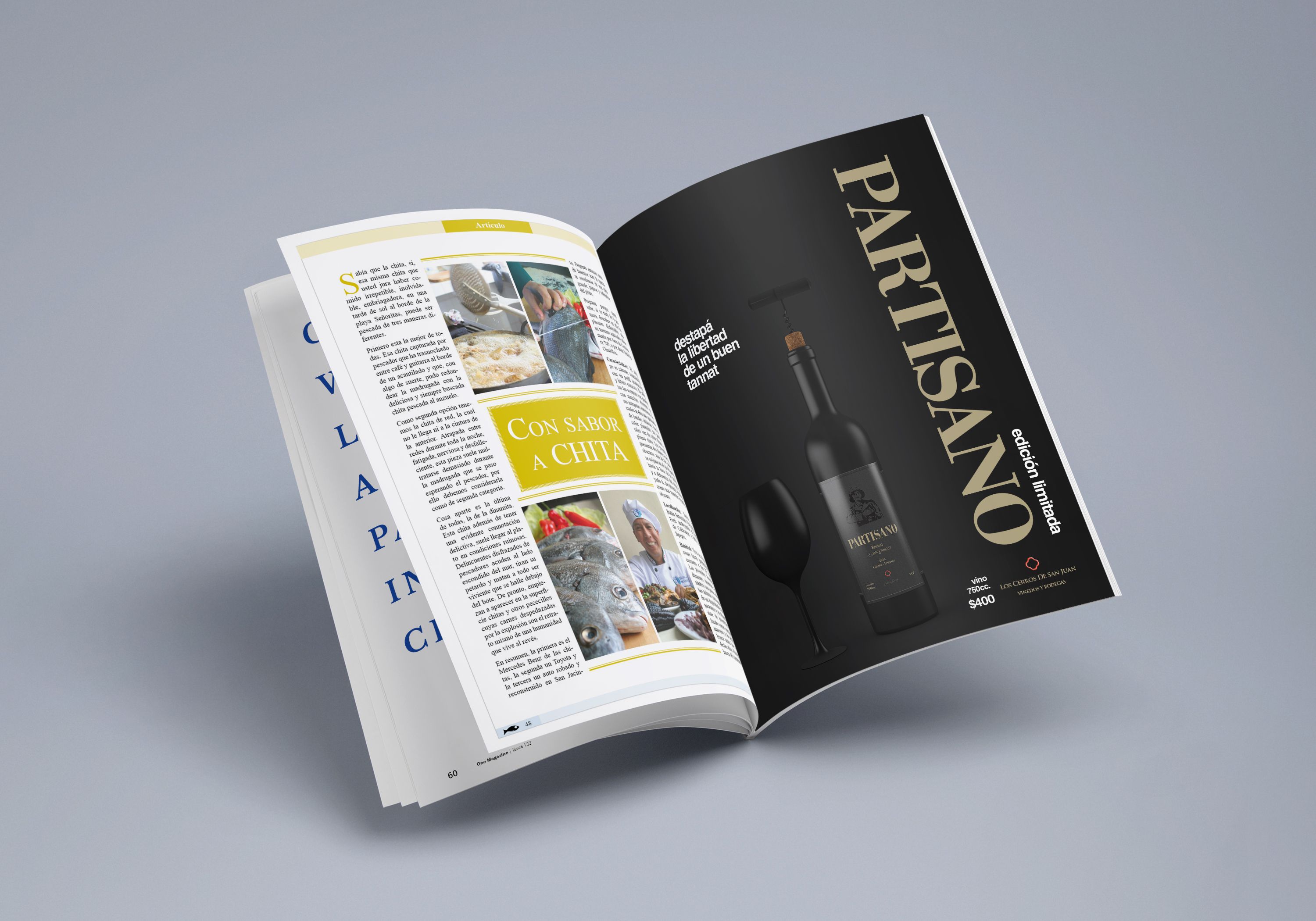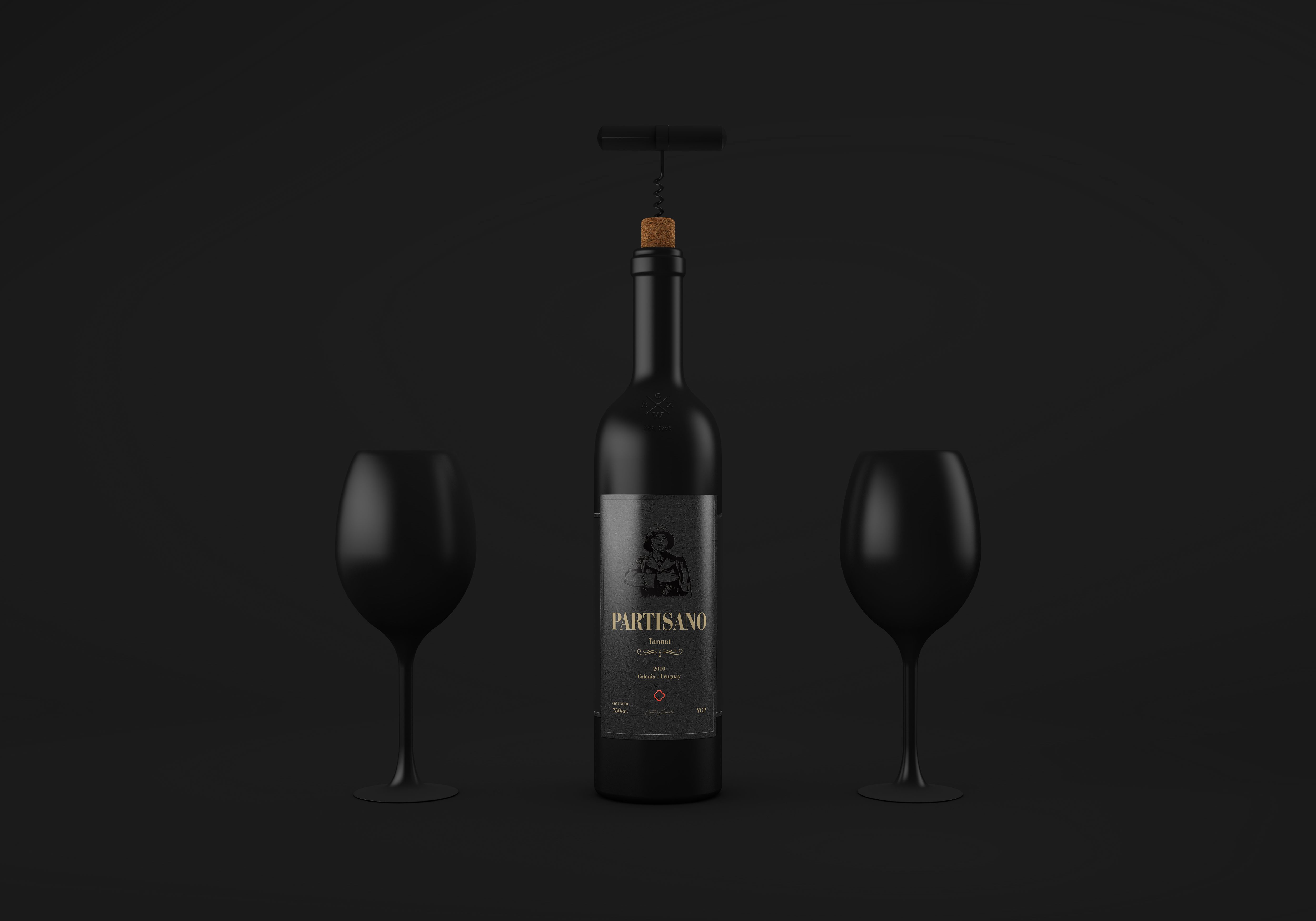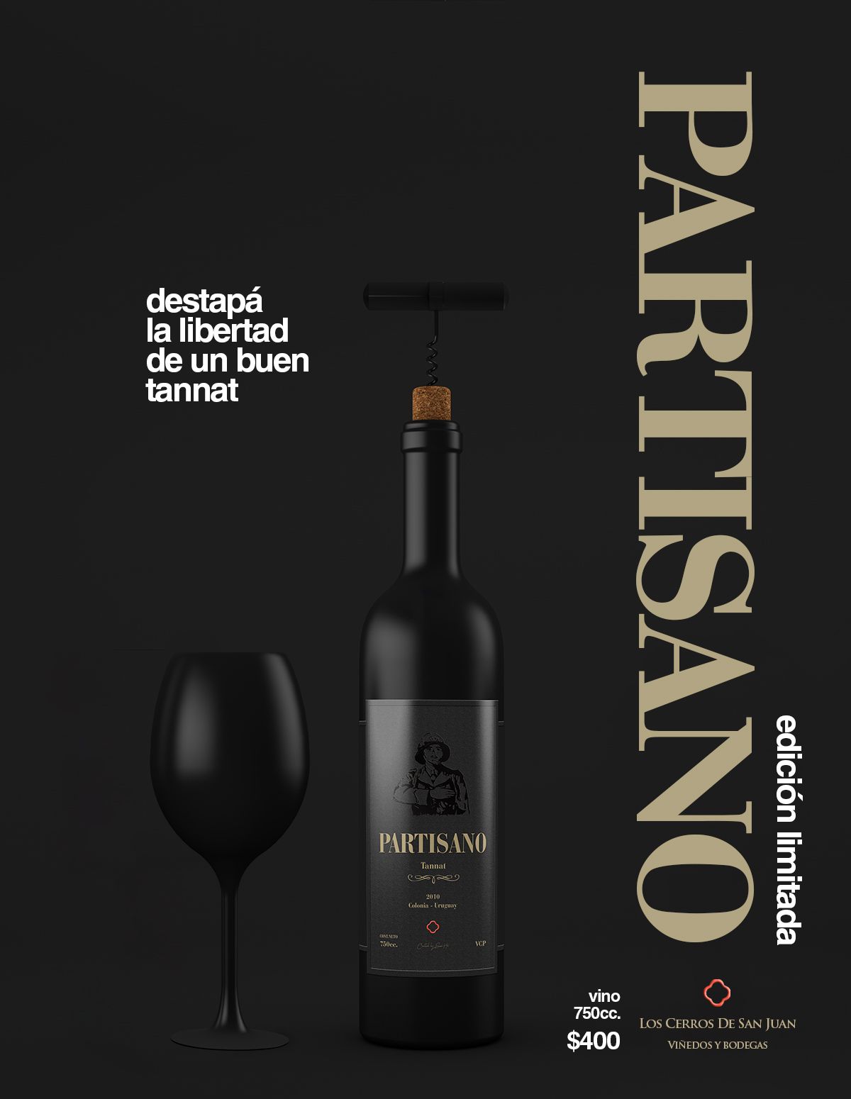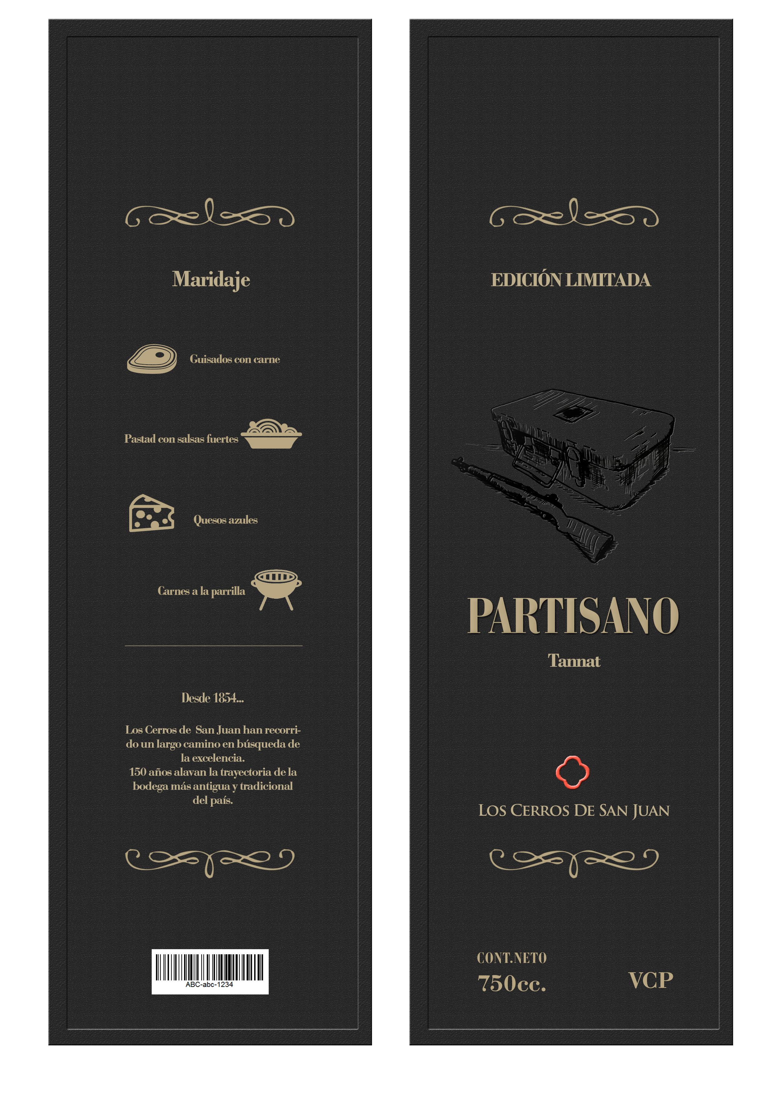 Propuesta de trabajo: realizar etiqueta, contraetiqueta, caja y articulo publicitario para revista de PARTISANO, un vino tannat de la bodega "Los Cerros de San Juan" (trabajo ficticio).