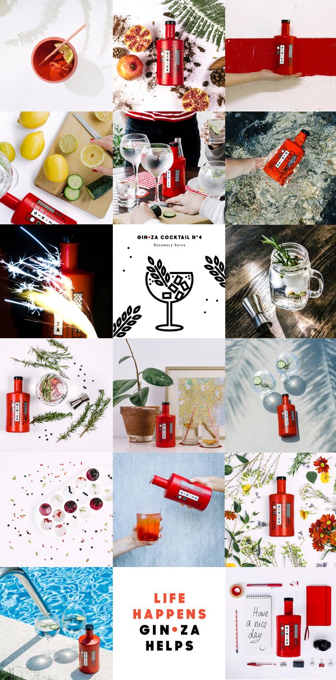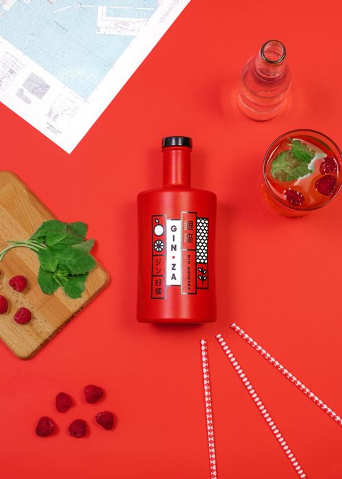 Packaging y dirección de arte para la marca de ginebra Gin·Za. Las formas verticales que simulan los carteles comerciales del barrio de Ginza sirven de soporte para comunicar algunos aspectos importantes de esta ginebra como son sus ingredientes, representados a través de ilustraciones sintéticas y tipografía.