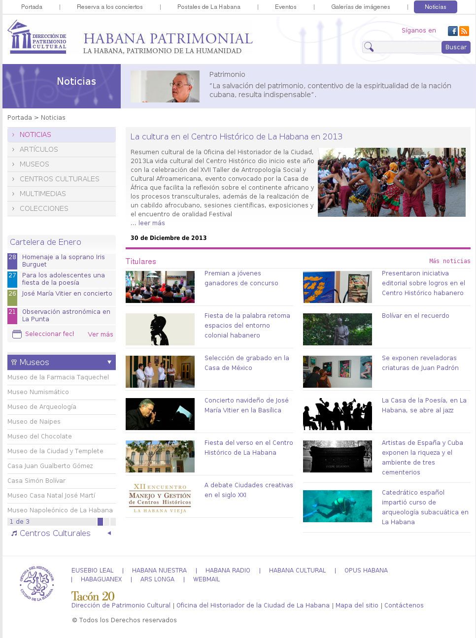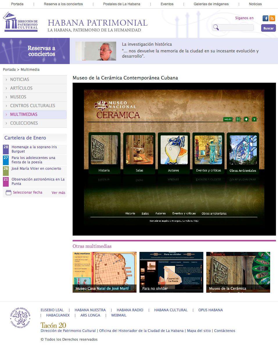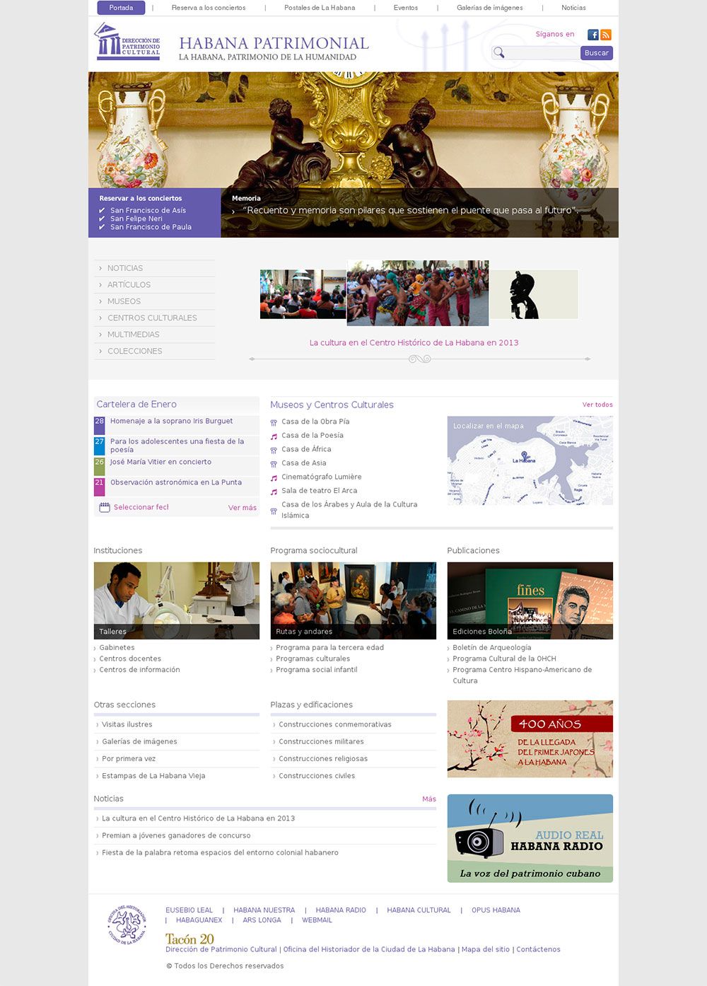 Proyecto de gran envergadura para importante cliente del área del Patrimonio Cultural de La Habana. Realice la maquetación sobre XHTML y CSS2 y para la parte interactiva jQuery. Este proyecto es de principios del 2010.