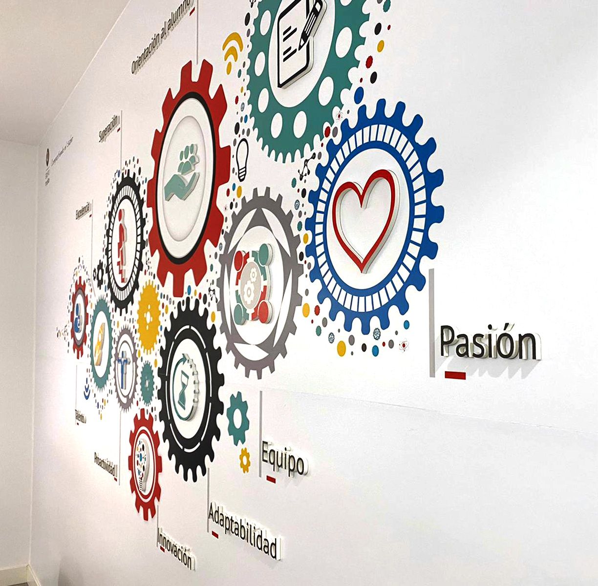 Mural decorativo proyectado en vinilo, con las piezas troqueladas en pvc, representando los valores de Implika centro de formación.
