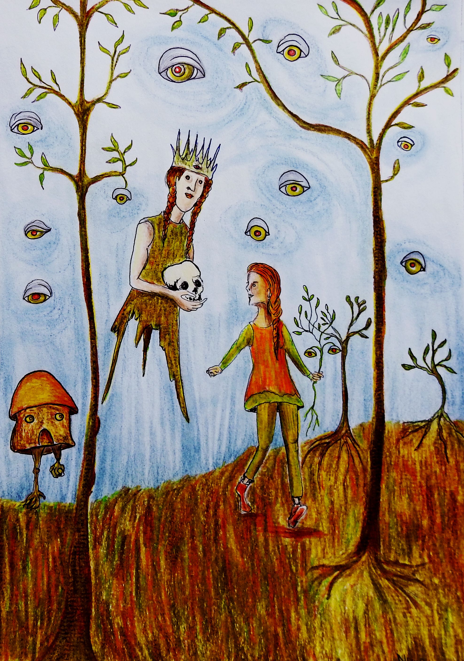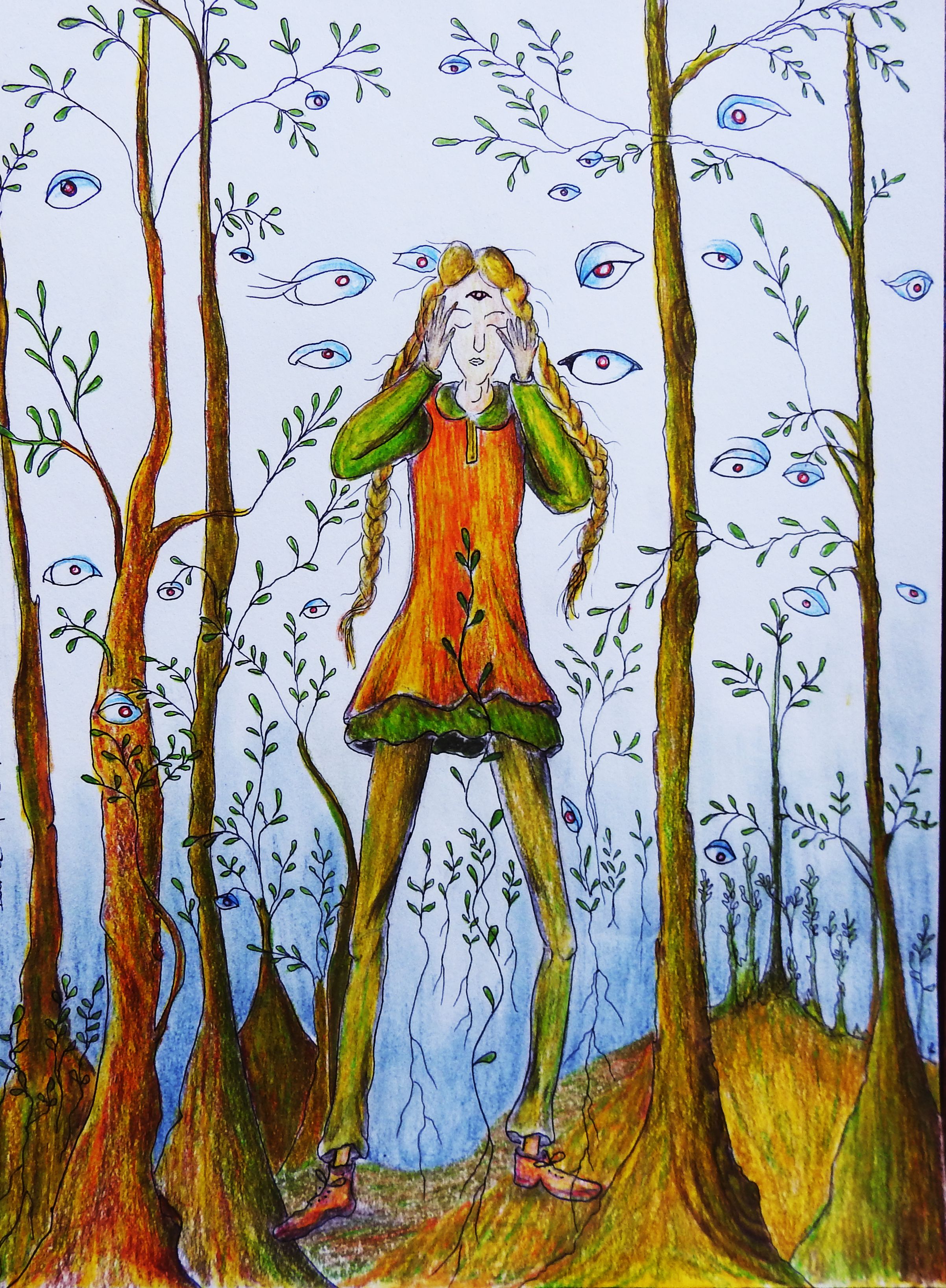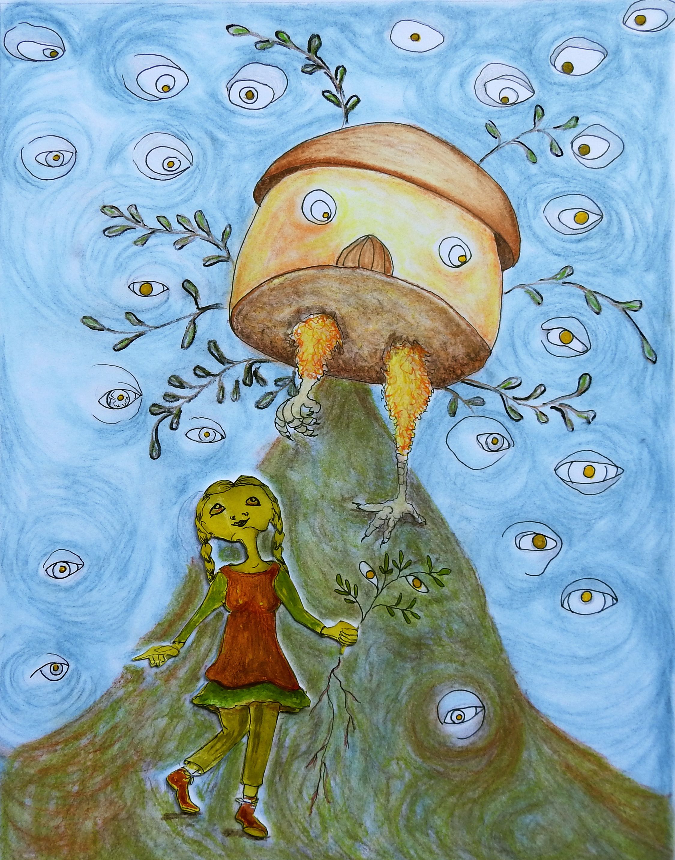 Vasalisa la sabia; gira en torno al tema de la facultad femenina de la intuición transmitida de madre a hija y de una generación a la siguiente. El gran poder de la intuición está formado por una vista interior, un oído interior, una percepción interior y una sabiduría interior. Con estas ilustraciones, pretendí complementar esta idea central del cuento y para ello usé la técnica del dibujo análogo complementado con los lápices de color pastel y algo de collage.