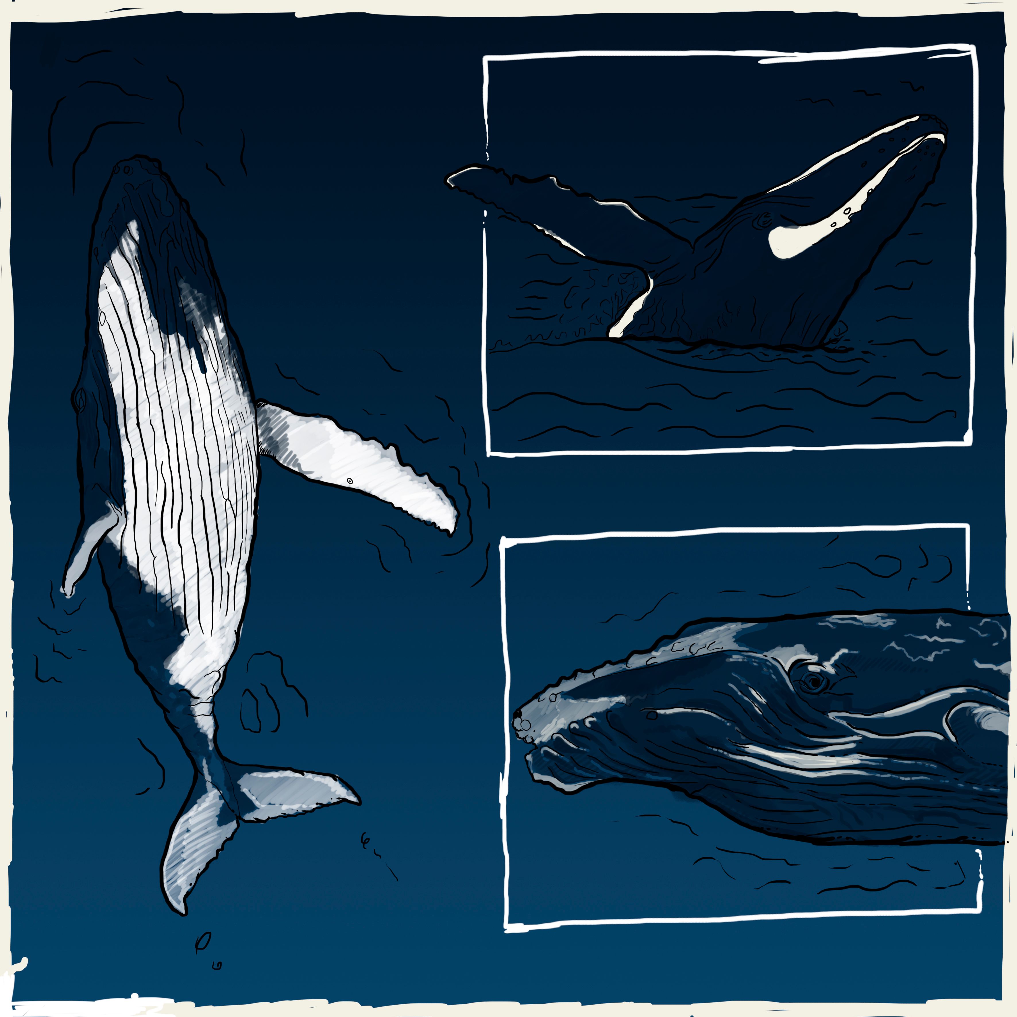 Lo que quise mostrar en esta imagen, es que a pesar de que las ballenas son uno de los animales más grandes del planeta y del océano, son animales netamente tranquilos y junto con los colores azules transmiten calma.