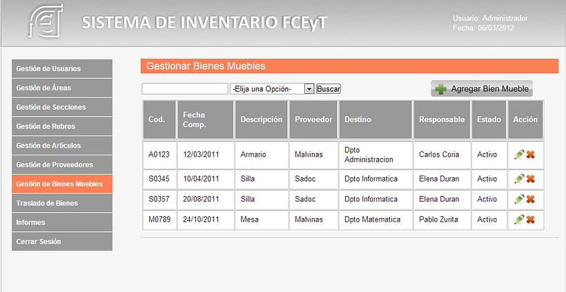 Sistema desarrollado en JSP y MySQL para el Dpto. de Administración de la Facultad de Ciencias Exactas y Tecnologías. El mismo permite llevar a cabo la gestión de bienes muebles, permitiendo un control de los bienes comprados y asignados a las diferentes secciones de cada uno de sus departamentos o áreas y que son trasladados numerosas veces.