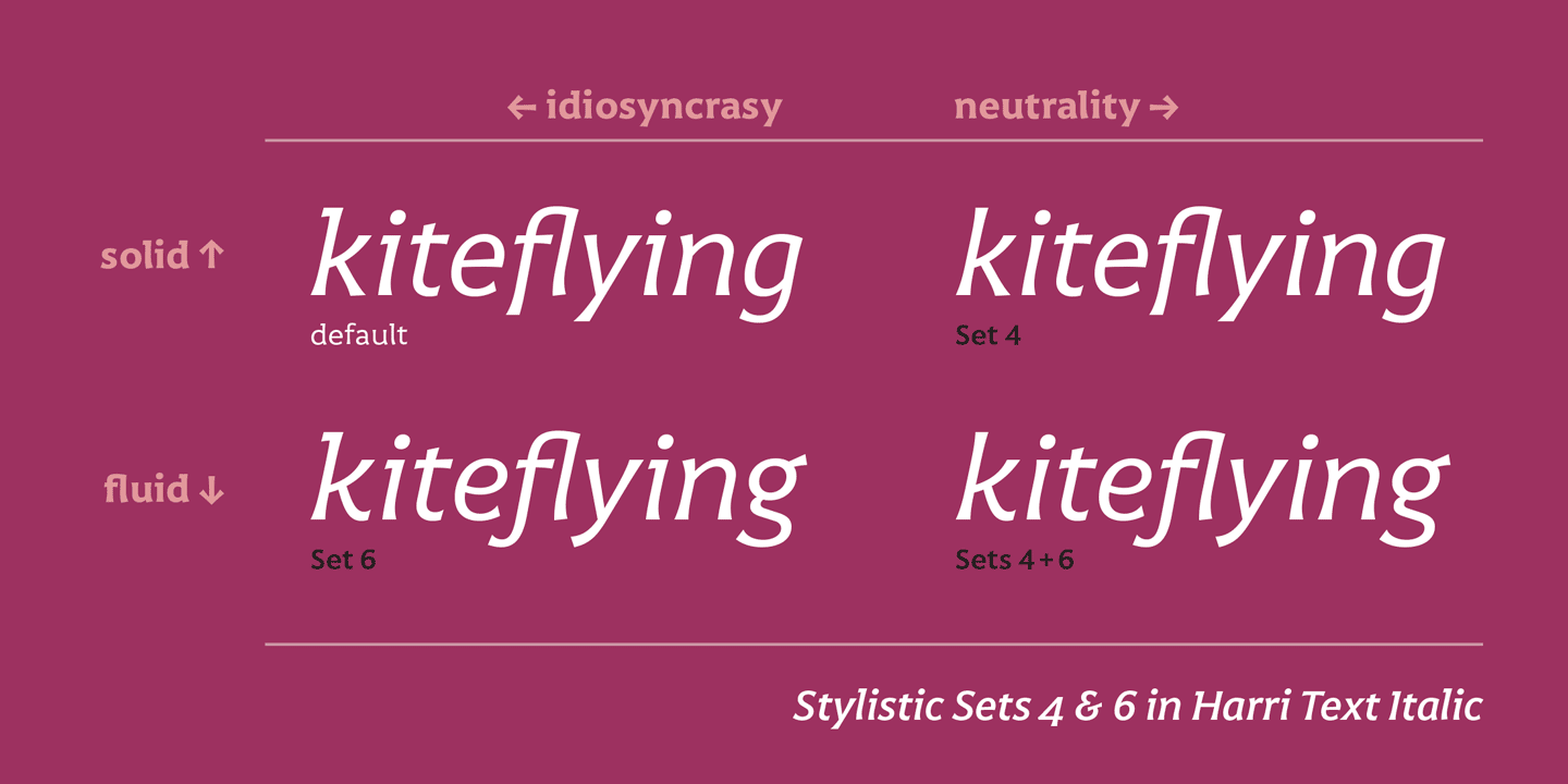 Harri Text es más que una simple extensión de su predecesora Harri Display. Comparte con aquella su origen y principal inspiración: la tipografía vasca o, para ser más precisos, el singular estilo de rotulación vasco. Pero a diferencia de Harri Display, que con sus dos juegos de mayúsculas incide en la utilización exclusiva de letras capitales habitual en ese estilo, Harri Text nace desde el desafío que supone crear una familia tipográfica para texto que incluya un juego de mayúsculas y minúsculas con un diseño armonizado, además de otros recursos tipográficos necesarios para una edición de textos profesional como son: versalitas, 4 variantes de números —alineados, antiguos, tabulares y proporcionales—, un juego ampliado de símbolos, superíndices, subíndices, ligaduras y hasta 5 variantes estilísticas en algunos de sus caracteres.