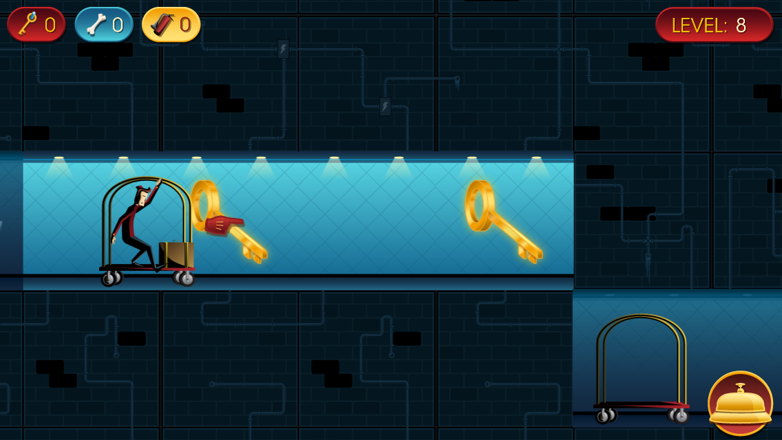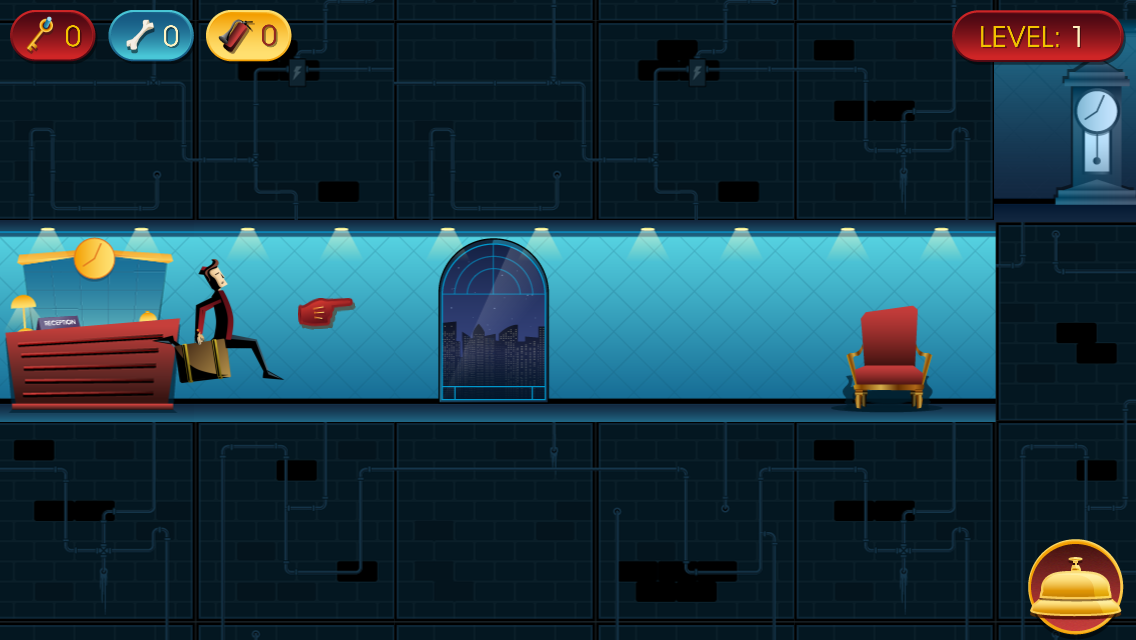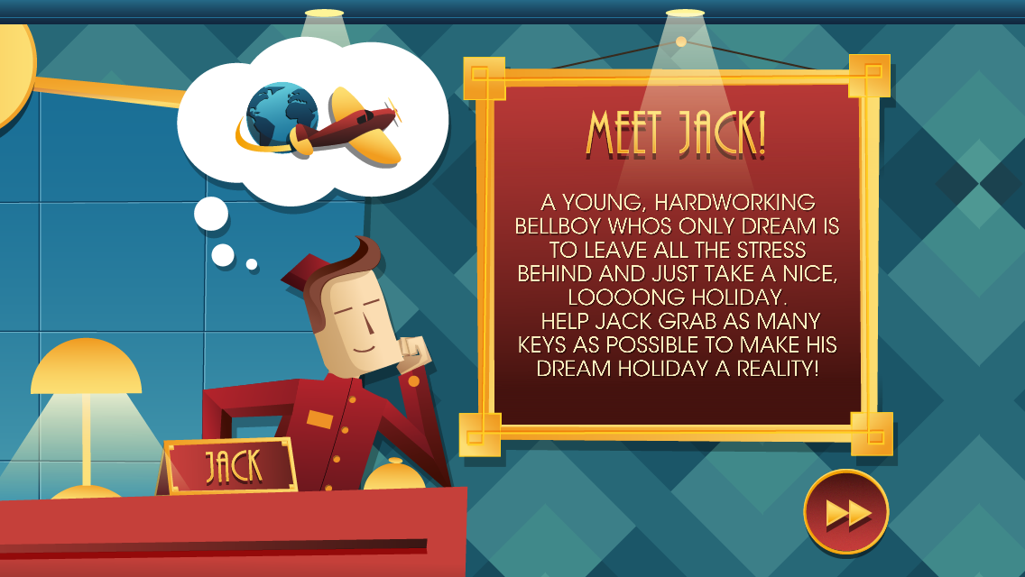 En este juego jugaras como Jack, un botones que trabaja en el famoso hotel Art Deco. Su objetivo es darse unas merecidas vacaciones, pero no va ser nada fácil. Ya que este no es un hotel cualquiera. Te estás moviendo constantemente y tienes que asegurarte de no quedarte sin suelo donde moverte, caerte o incendiarte... teniendo esto en mente, tienes que llevar las maletas de los clientes a sus habitaciones, cuidar de sus mascotas y satisfacer sus caprichos y recoger las llaves que han dejado tiradas.