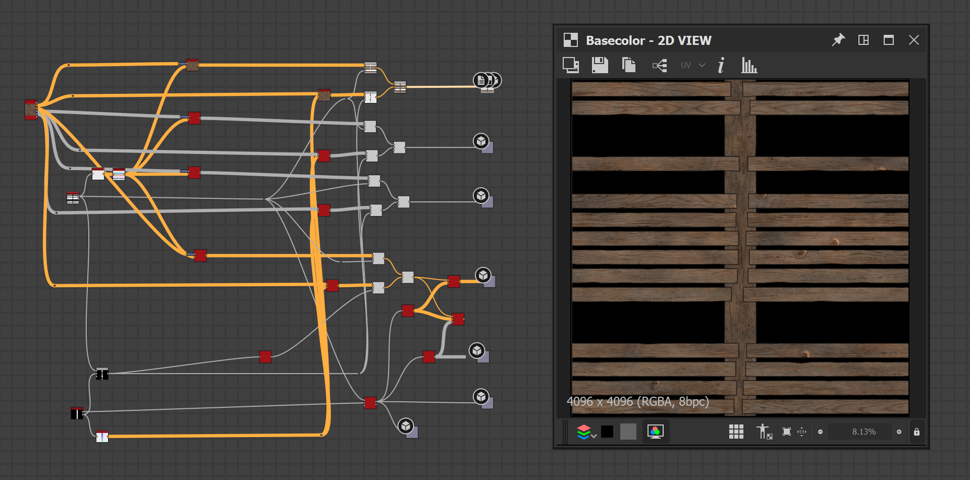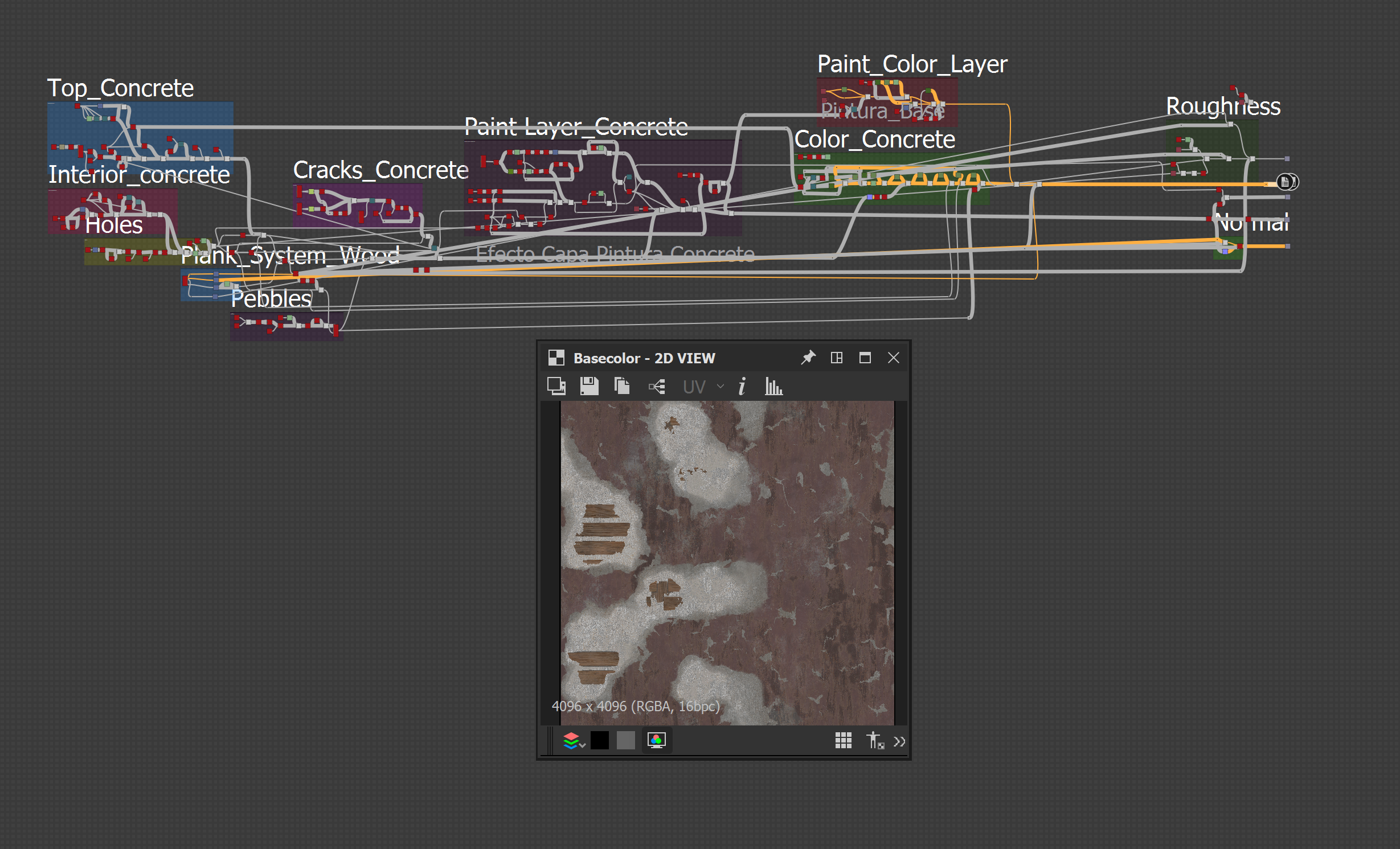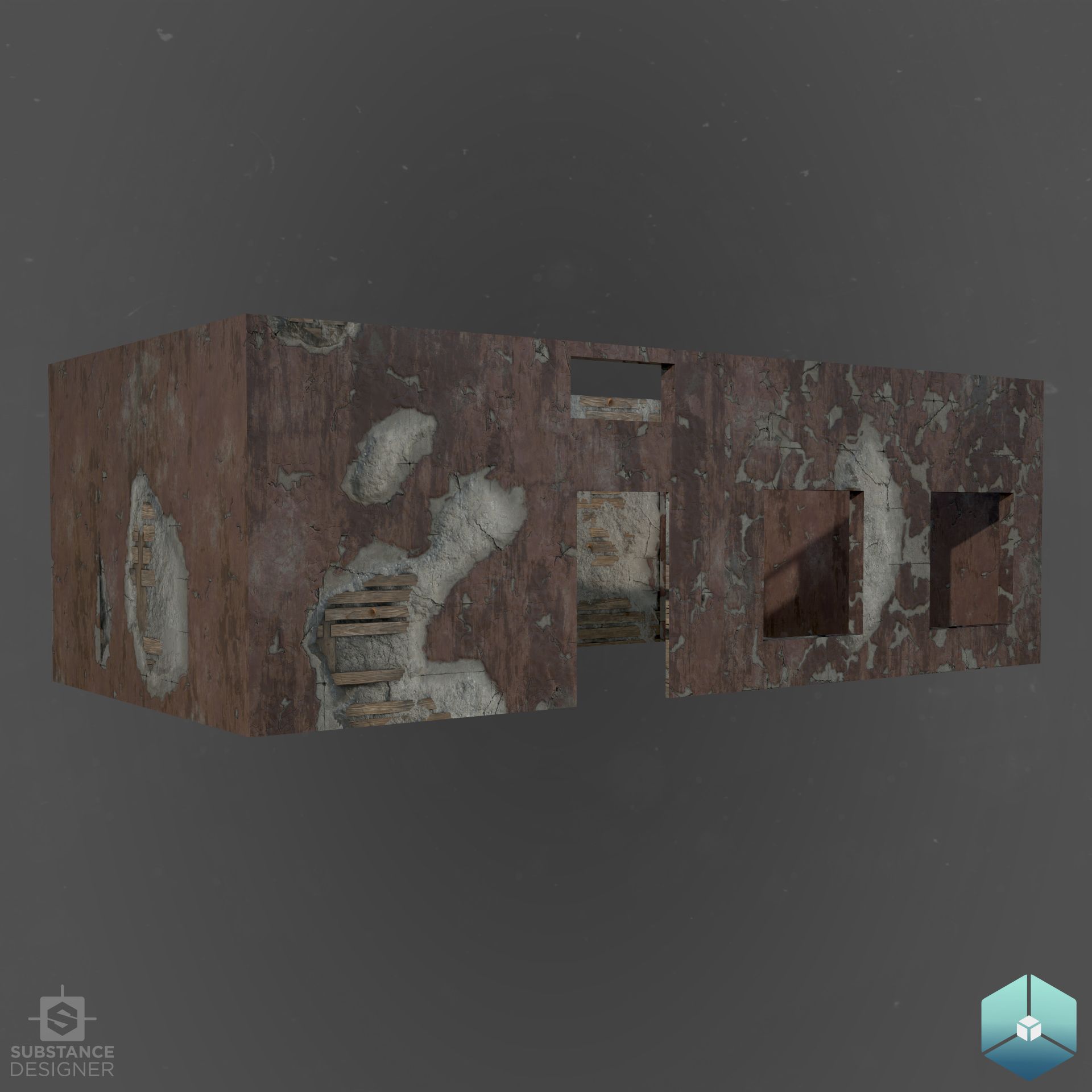 Esta substancia es totalmente modificable (enseño algunas de las capturas del breakdown con los parámetros modificables). Las tablas de madera se pueden alterar a gusto, en número, ancho y alto, bevel, orden, etc, así como su textura, con un parámetro de envejecimiento que añade cracks y astillas y oscurece la textura. Así mismo la parte del muro de cemento también es totalmente procedural. Son hasta 3 capas de cemento para poder tener un relieve detallado en las rupturas, cracks y agujeros que se pueden añadir o quitar. La capa de pintura también se puede cambiar de color, añadir o quitar los desgastes y demás.
