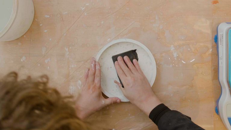 Olivia uses wet and dry sandpaper of varying strengths to finish her project, first submerging both the tray and the paper into the water to remove any dust. Use the rough sandpaper to reveal the pattern, then move on to the finer version to remove any scratches, applying a small amount of pressure so as not to distort the design.