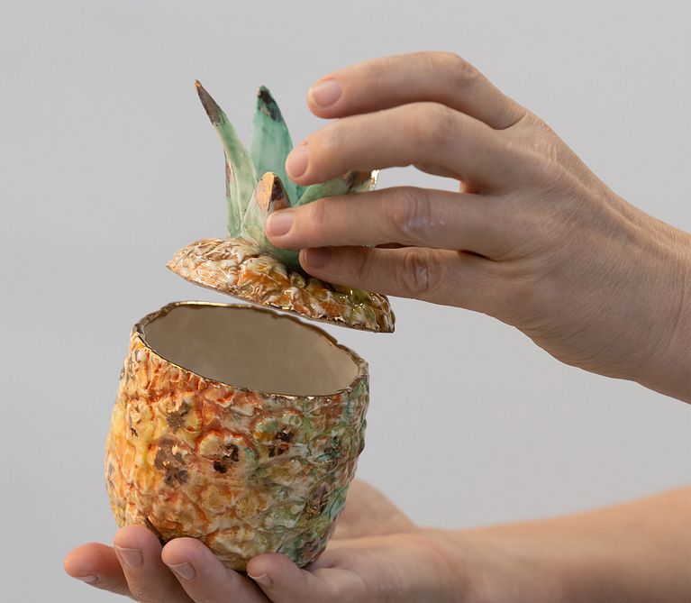 Have you ever wondered how to convert an everyday object into a glazed and decorated ceramic one? Think how much fun it would be to be able to use something you’ve made yourself in your home or create a gift. In this case, I’ve used a pineapple, all fruits have such character, texture and colour, I thought this was a good way to show you something a little more complex so you can believe anything is possible.