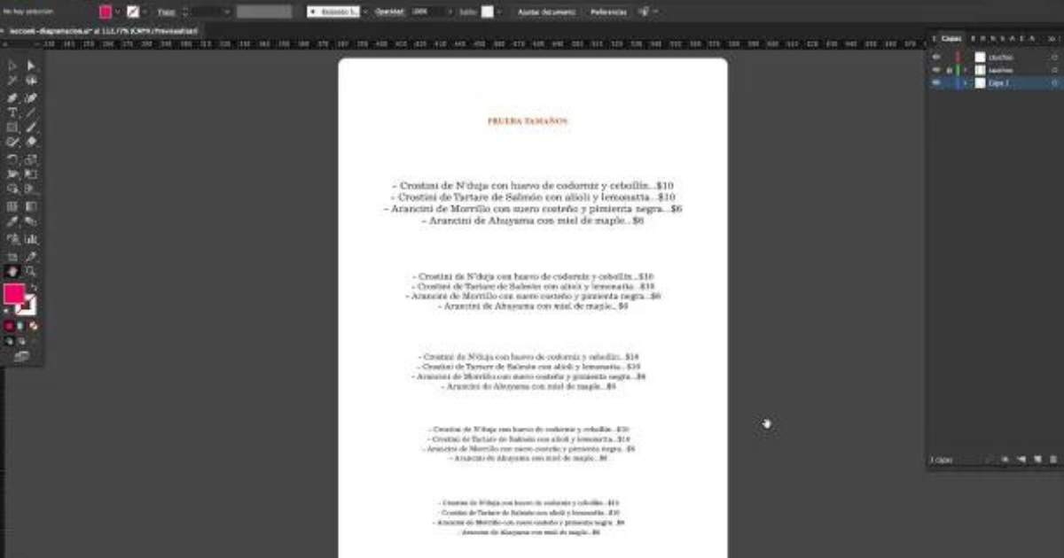 Rico recommends starting by adding the legal texts, since we can never skip them, and arranging the rest of the texts from that point. It is also interesting to do a size test (that is, test how the font we are going to use looks like in different sizes, printing it and seeing what it looks like in physical form before adding it to the menu design).