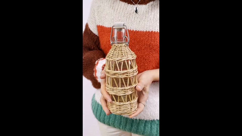 The second piece moves away from vibrant colors and opts for a more natural approach. It is made of wicker, a traditional material in basketry, and features a more openwork weave that allows the glass inside to show through. This piece demonstrates how the art of basketry can merge with modern aesthetics without losing its traditional charm.