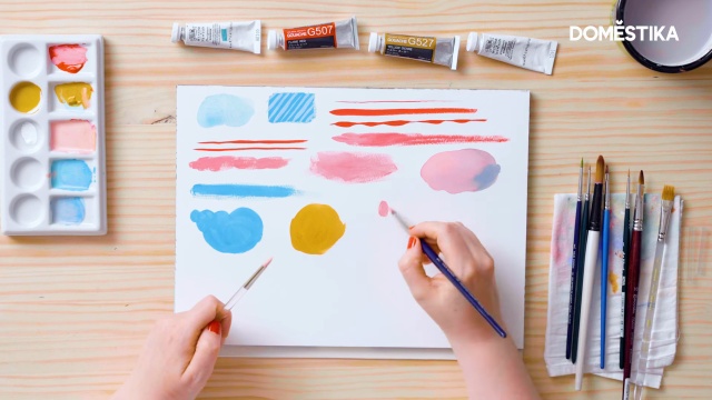 To work with gouache, Julia prefers to use synthetic brushes, as they have a greater capacity to withstand friction, so their tips are less damaged. Try different strokes using each of the brushes suggested in this tutorial.
