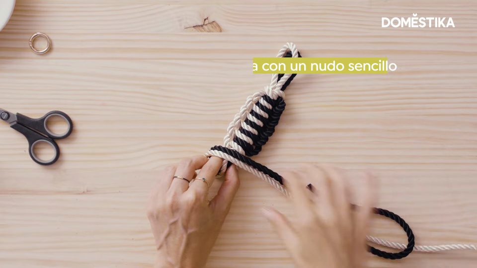 Now that you have finished the project, it remains to decide how to finish the bottom cords. Beatriz teaches you two ways: the first consists of lowering the ends of the tape, leaving it at half a centimeter, and then tying a knot that you will push all the way down. The second is to make fringes by removing the tape and hitting the cords against your hand to fray them.