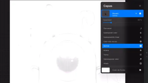 After choosing the black color to ink the sketch, reduce its opacity and choose a layer over it to start drawing. This will allow you to draw on the original line of your sketch, as if, in the analog world, you were drawing on tracing paper on a sheet of paper. To draw different parts more quickly, the teacher recommends to do it on separate layers.