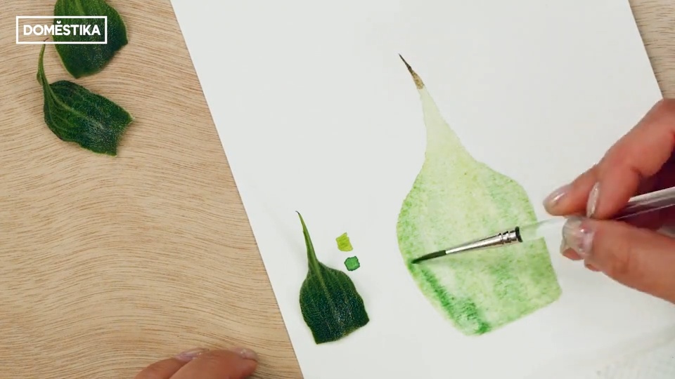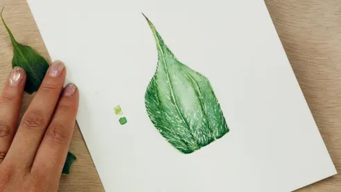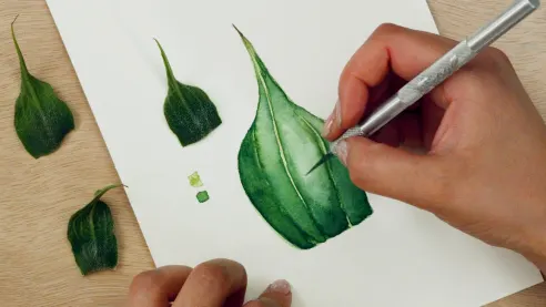 As an example to illustrate a textured leaf, Paulina has chosen a sunflower sepal. It is a leaf that has a velvety texture and to illustrate it we will need to use a cutter. Once we have the first two layers of watercolor dry, which begin to give volume to the leaf, we will scrape the surface of the leaf with the cutter to generate that "hairiness" of the sepal.