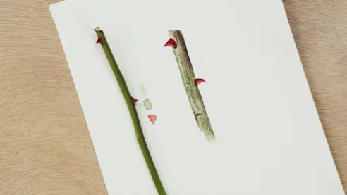 Many plants and flowers have a stem full of thorns, and to illustrate this we must take into account the volumes it generates and the diversity of textures. In Paulina's example, the thorn is reddish in color and this is something to take into account when painting it. It is important to let the green color dry first so that when the thorn is included they do not mix. Then it is important to take into account the volumes that we want to replicate to imitate them, in this case the stem is cylindrical and the thorn, a cone.