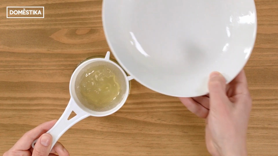 Time to create our mixture! We will recover the egg white that we had prepared ahead of time and we are going to prepare it by first removing the foam layer that will have been left on the surface, as we are not going to need it.