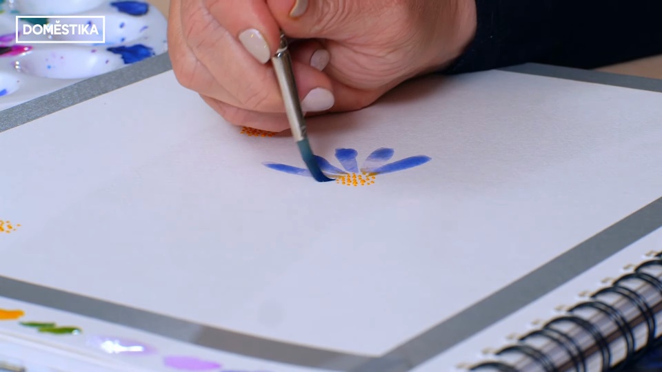 Once we have the main colors in our improvised palette, we are going to make the first layer of the illustration. If we are painting flowers, we will start with the pollen in the center creating small dots with our brush. Once done, we will immediately move on to the petals of the flowers and the stems of the plants. This is because when painting with watercolor, the aspect of time is very important. We will not let the paint dry in this first phase, but we will take advantage of the fact that the paint is still wet to continue painting.