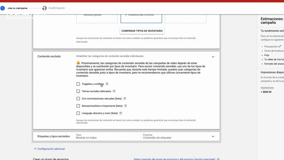 In content, we can exclude some types of content that are a bit sensitive, such as tragedy and conflict. Let's remember that our ads appear before watching a YouTube video, for example; so, if the video that was going to be watched is about some conflict or sensitive social issues, what we can do is avoid appearing in that kind of content by simply pointing out what kind of topics we don't want to be related to.