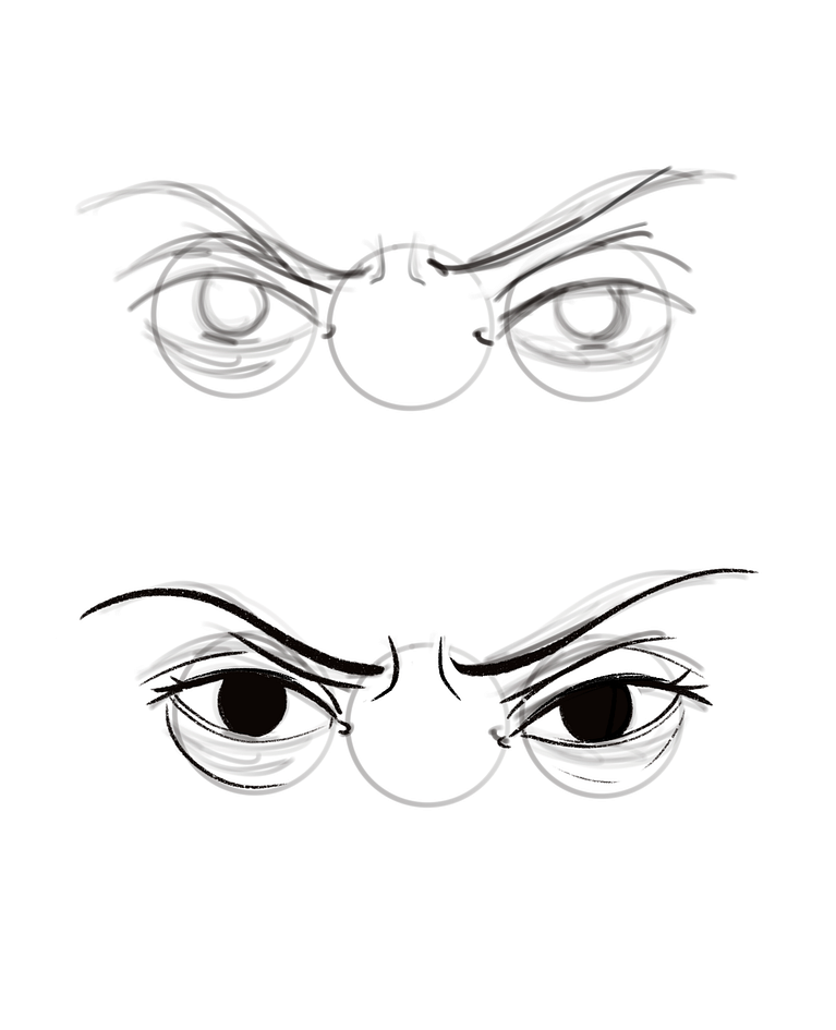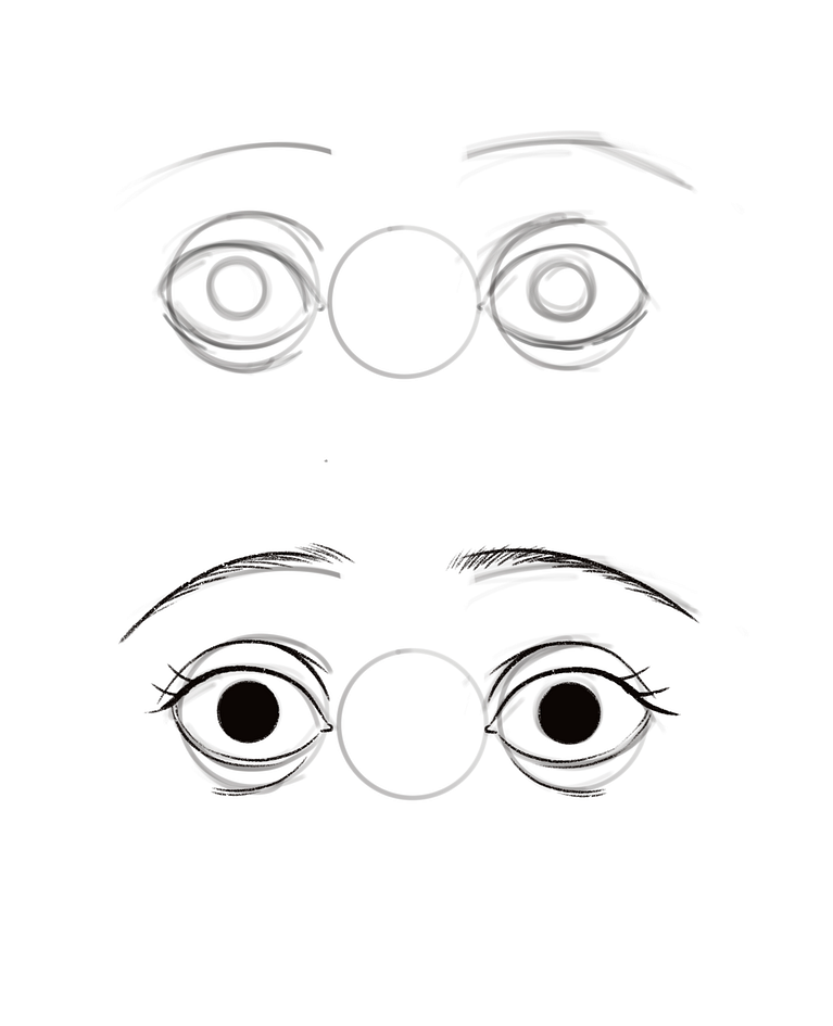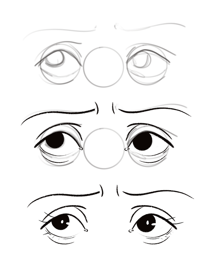 Now as it's been said, the circle is the eyeball, and now we will place the rest of the elements of the eyes on it. Draw the line that makes the upper lid, and then draw the waterline of the eye.
