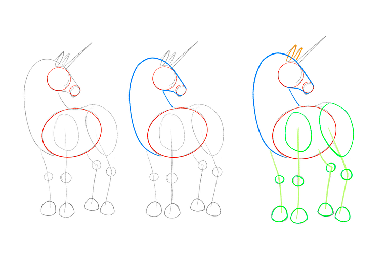 Sketch the major shapes of the unicorn, which are shown in the picture below and represented in the colors blue, yellow, green, and red!