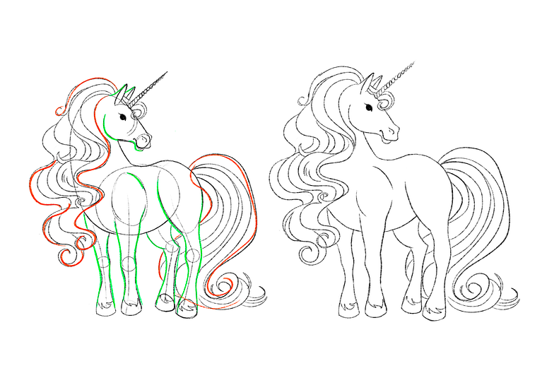 Following the red strokes shown on the photo below you can establish the basic shape and flow of the unicorn's mane. Once that is completed you can lightly sketch more detailed individual strands of hair, following the natural curves you have already outlined.