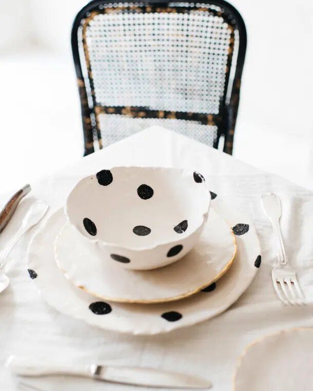 Powdered shades and a characteristic gold border make Somos Bonjour tableware and ornaments a classic of modern ceramics. This is another of Paula Casella's favorite ceramic studios, she points out the monogrammed tableware as the star of their collection.