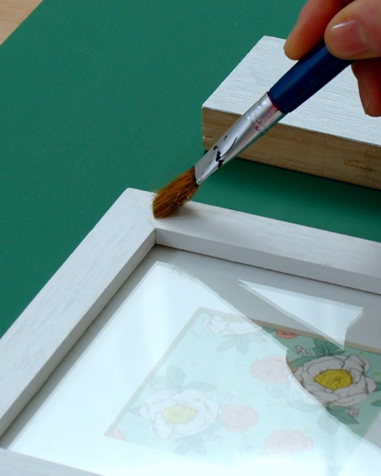 Paint the base of the frame in the color you want. For this one, Coy painted her frame white, applying three layers.