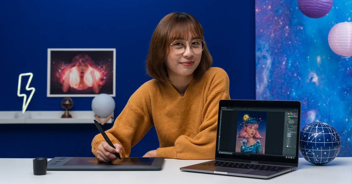 Karmen Loh, also known as Bearbrickjia (@bearbrickjia), is an independent illustrator and character concept artist from Malaysia. Loh uses her dreamy illustration style to explore fantasy worlds and femininity; her work channels tranquility and ethereal beauty. You will often find her portraits decorated with details from outer space, the ocean, and flora. She draws inspiration from Studio Ghibli’s Hayao Miyazaki, James Jean, and Aykut Aydogdu.
