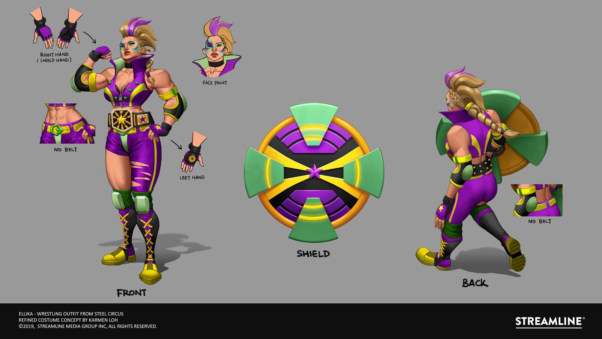 As part of another Streamline project, Loh also worked on the multi-player online game set, Steel Circus. Set in the year 2350, the game’s story unites champions from different factions for an annual sports tournament. Loh created this wrestling outfit for the character Ellika.