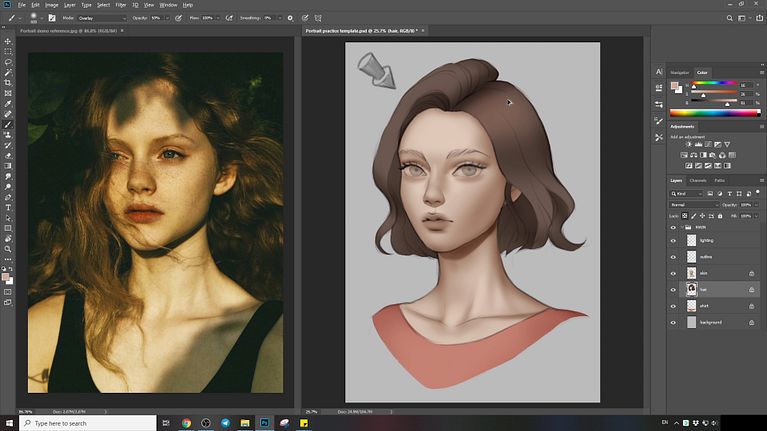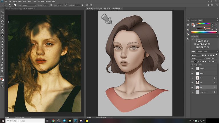 You can either create a drawing based on a reference photograph—look for one where the person is in a similar position with the same light source that you'd like to replicate. Open your image reference and your drawing side by side in Photoshop. You'll use this as your guide when determining what parts of your portrait will receive shadows and highlights.