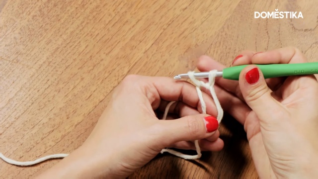 Insert the hook inside the circle, take the thread and pull it through the circle. Take the thread (the one coming from the ball) and pass it between the two strands, forming a point. Repeat several times (as in the image below), until six of these points are formed, in the form of spikes, coming down from the hook.