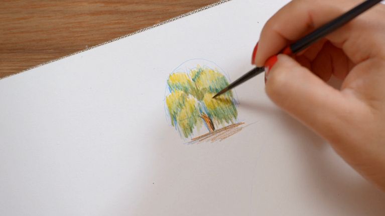 Shade the tree with the same pencil, looking at the areas of light and shadow to decide where you will place each shade of pencil. The important thing is not so much the details as getting the overall look of the tree; once you have it, start applying the color with the watercolor pencils. You can also paint a little bit of the ground under the tree, to give it some more context.