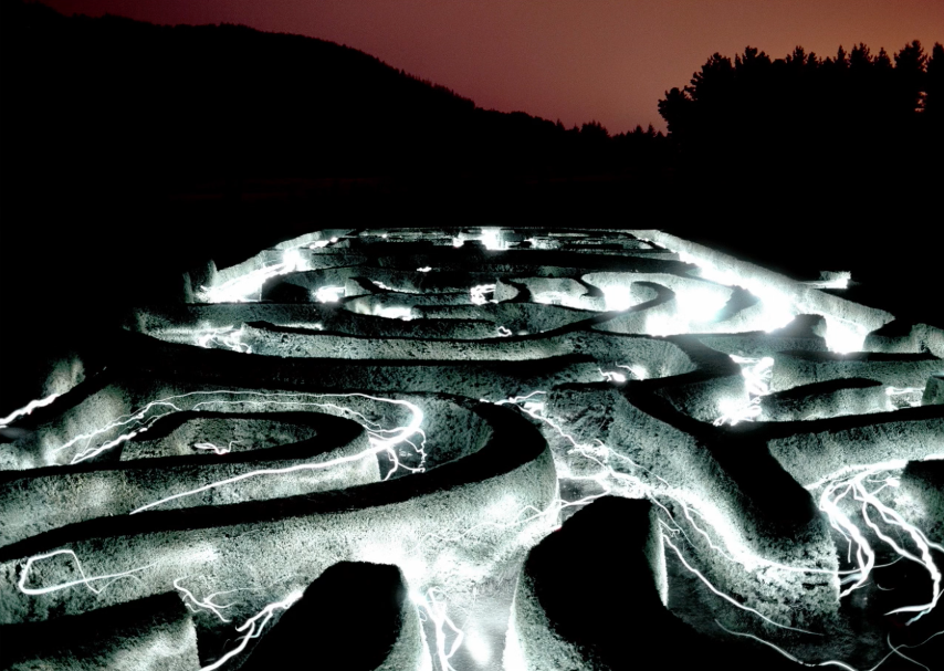 To achieve this, Alejandro asked eight people for help, who walked from one side to the other inside the labyrinth with a lit flashlight in hand. The lines that can be seen were generated by these routes, while the light spots were achieved when the people who assisted him stood still in the same place for several seconds.