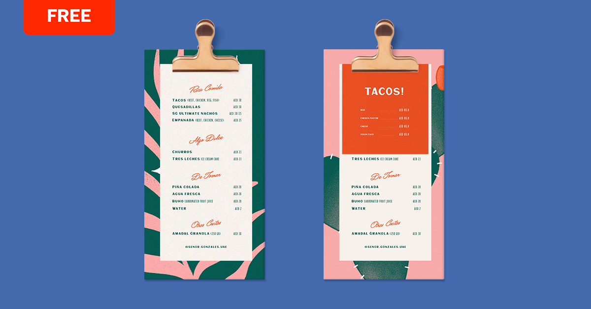 This template includes two fully customizable rectangular restaurant menus. Clipboards that hold the menu with a metal clamp can also be edited and added to your design, as Lane and Sofia show in this example. In addition, one of the menus includes an editable and customizable sheet so that you can add other elements to your menu.