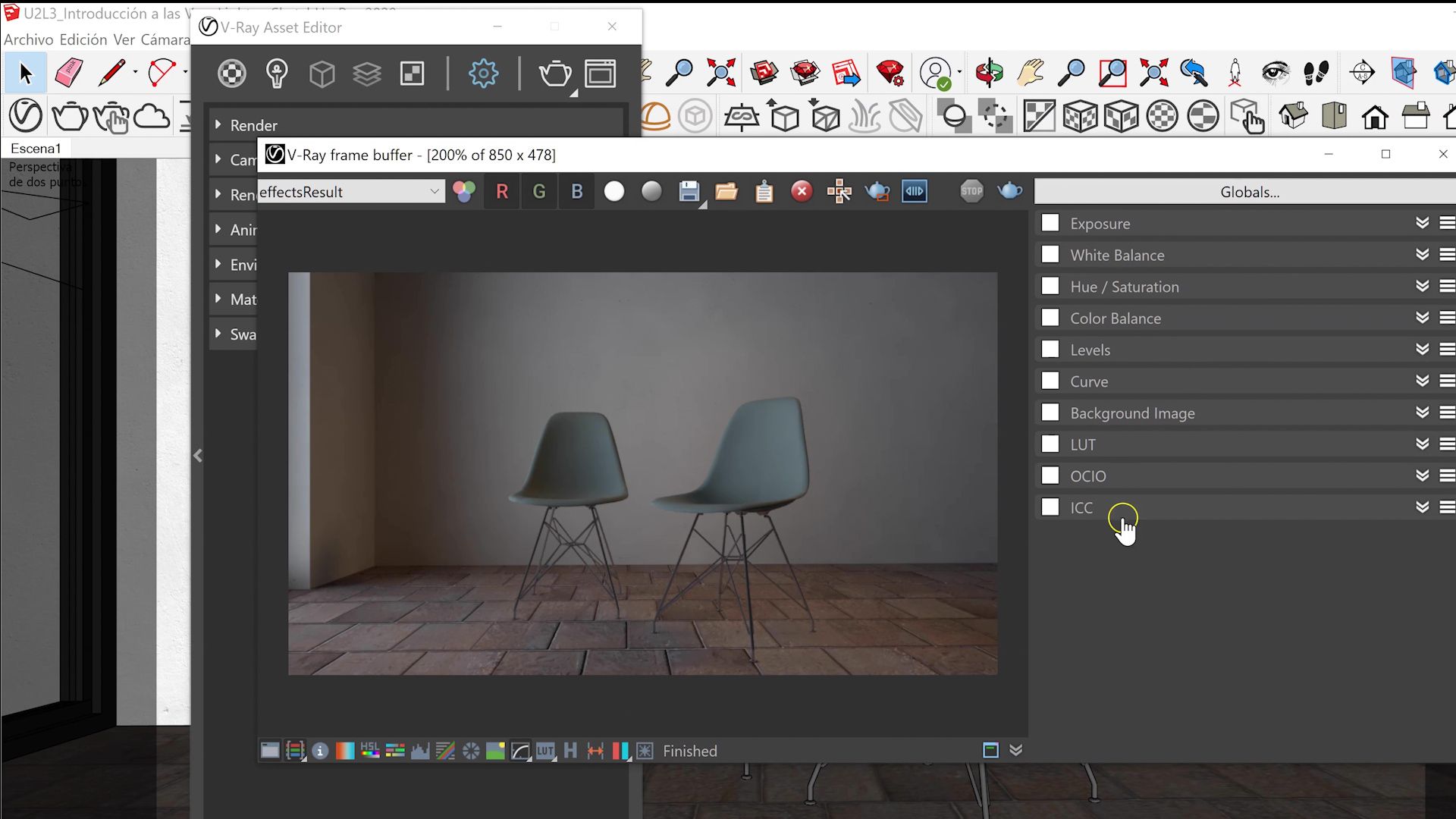 The frame buffer is the window that appears when we render our scene, which shows us the display of the render. If you go to its bottom, you will see a series of icons. Choose Show corrections control to be able to edit the image corrections of your scene more deeply.